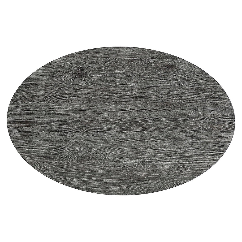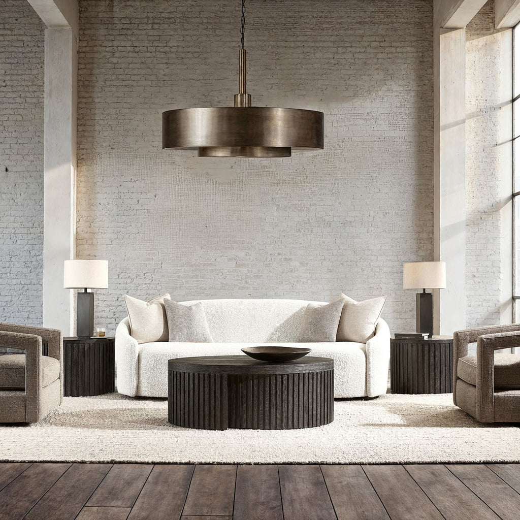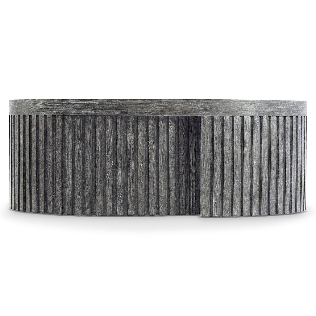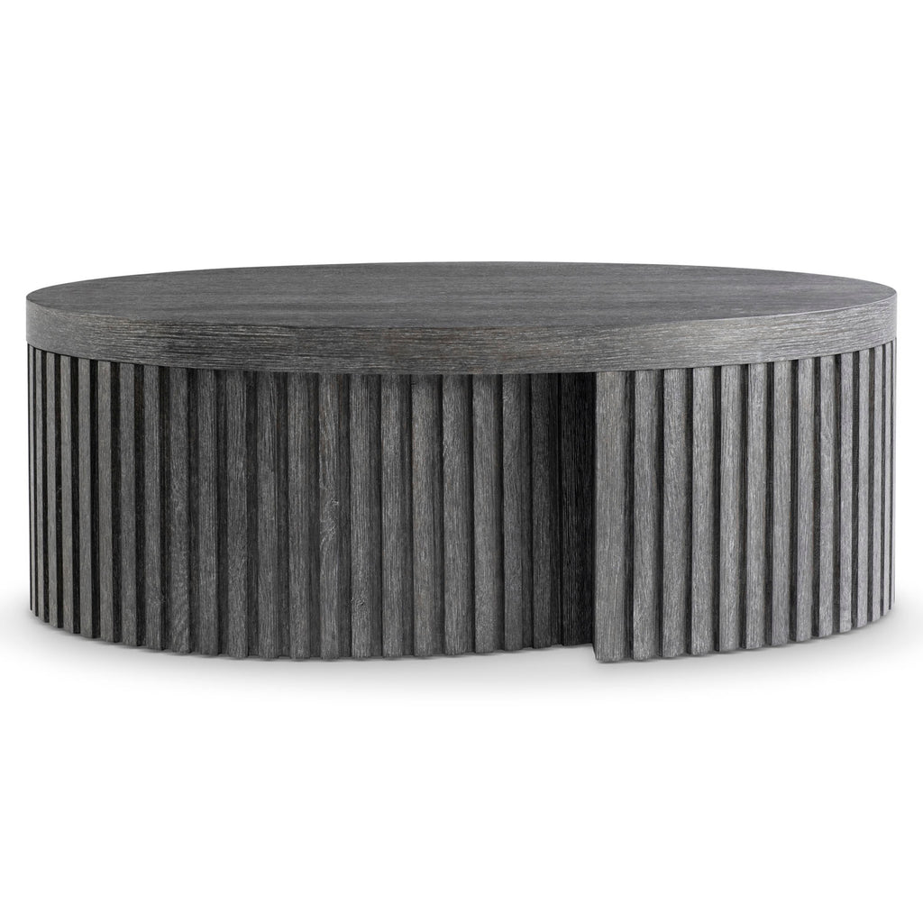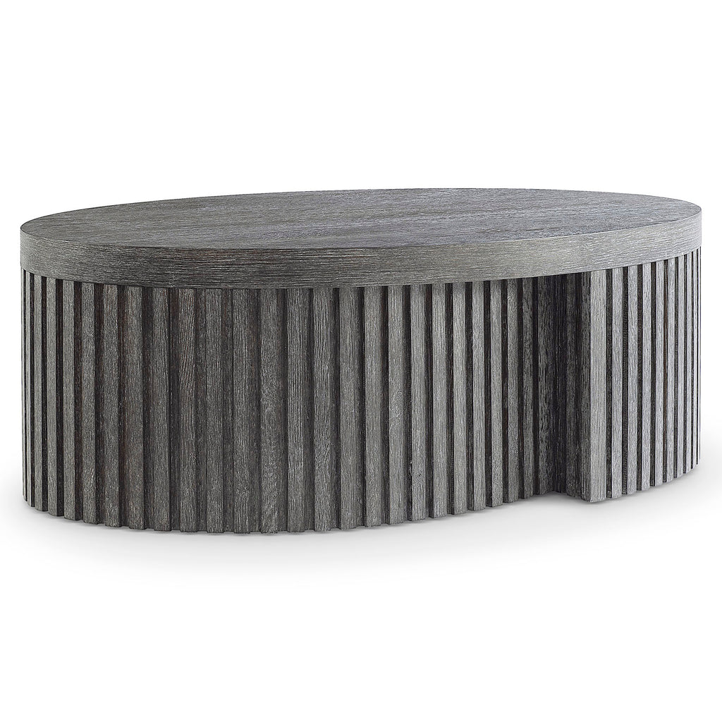 A moody, dark finish and architectural inspiration give the Menton cocktail table its distinct design. The base wraps around like a ribbon crafted of linear reeding. It supports an oval top that showcases the wood’s natural grain through the deep Sutton finish.