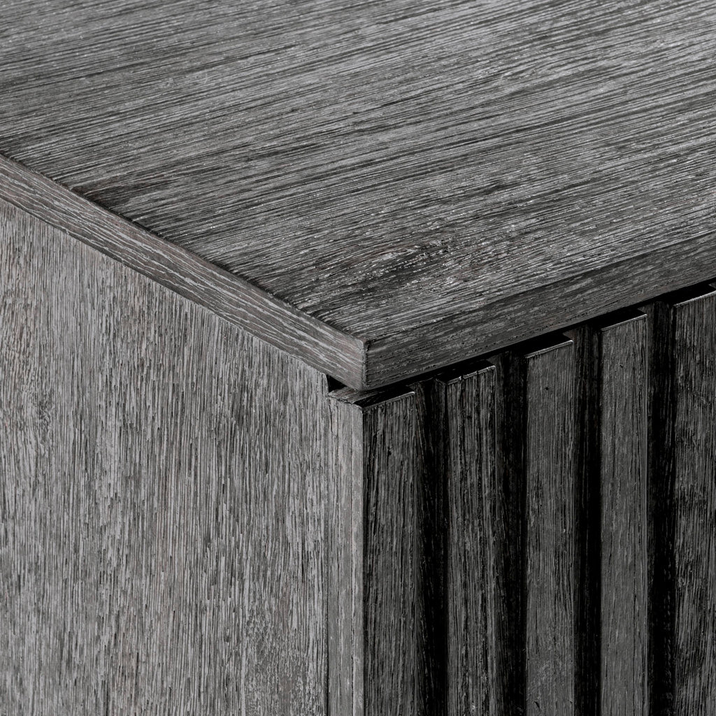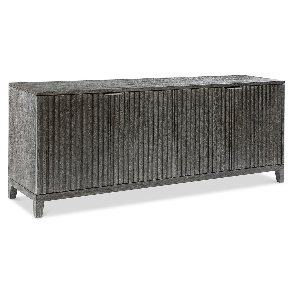 The deeply reeded door fronts on the Menton entertainment credenza craft a visually stunning style that highlights the moody Sutton finish. The four doors have cast aluminum tab pulls and conceal adjustable shelves, grommets and vents. The look is casually rustic and beautifully modern.