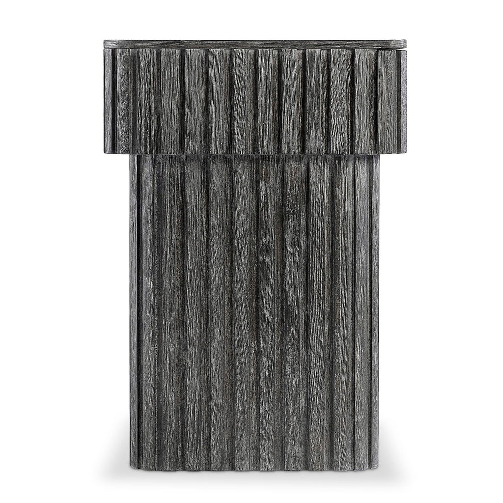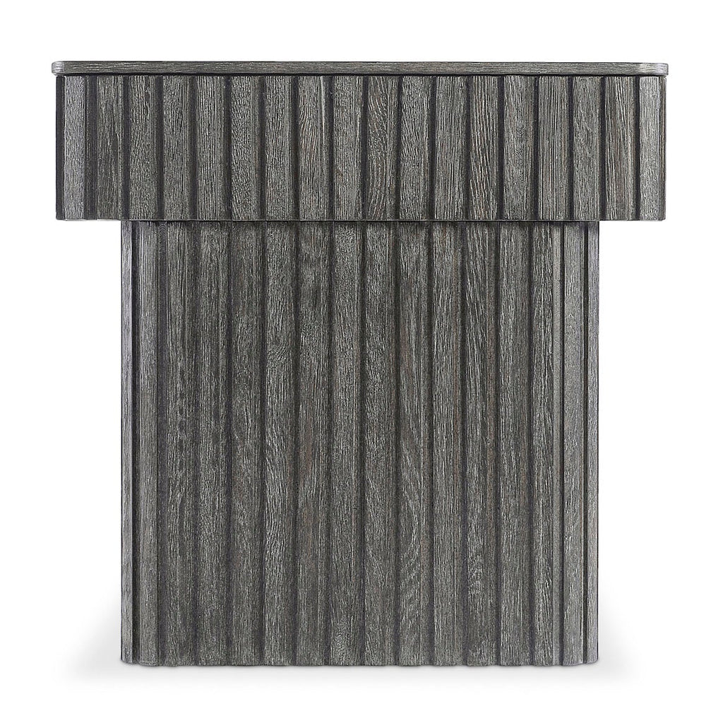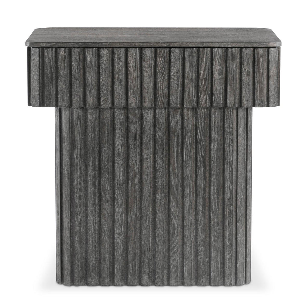 Inspired by architectural design, the Menton nightstand features deep linear reeding around the base and the sides of the top, with a smooth table surface. A hidden pull-to-open drawer is accessed with a finger pull. The deeply textured woodgrain is highlighted with the Sutton finish.