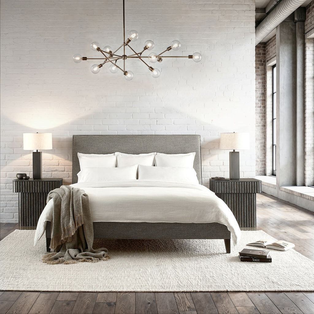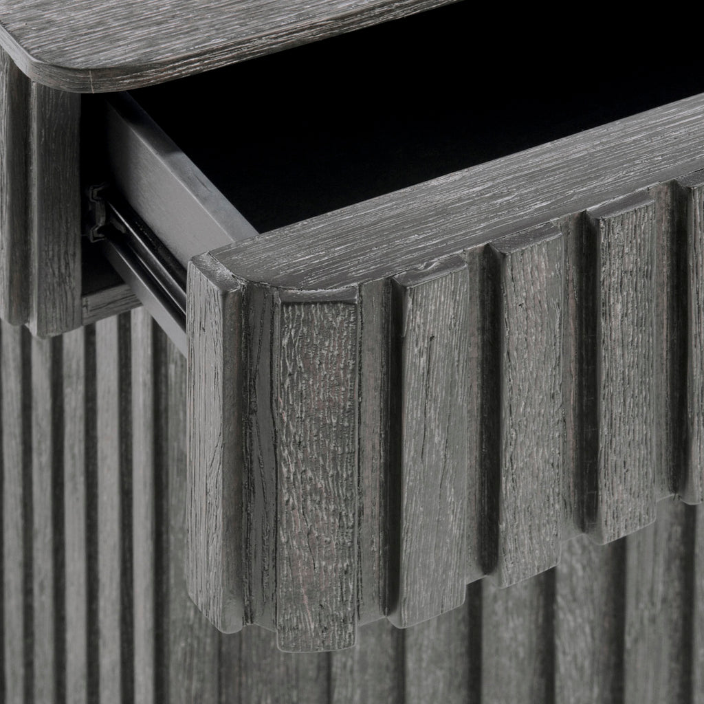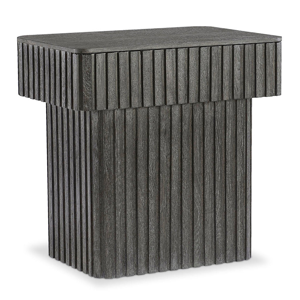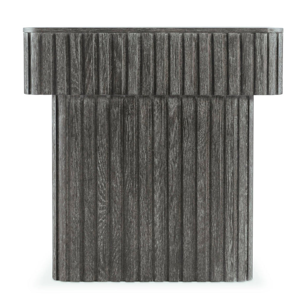 Inspired by architectural design, the Menton nightstand features deep linear reeding around the base and the sides of the top, with a smooth table surface. A hidden pull-to-open drawer is accessed with a finger pull. The deeply textured woodgrain is highlighted with the Sutton finish.