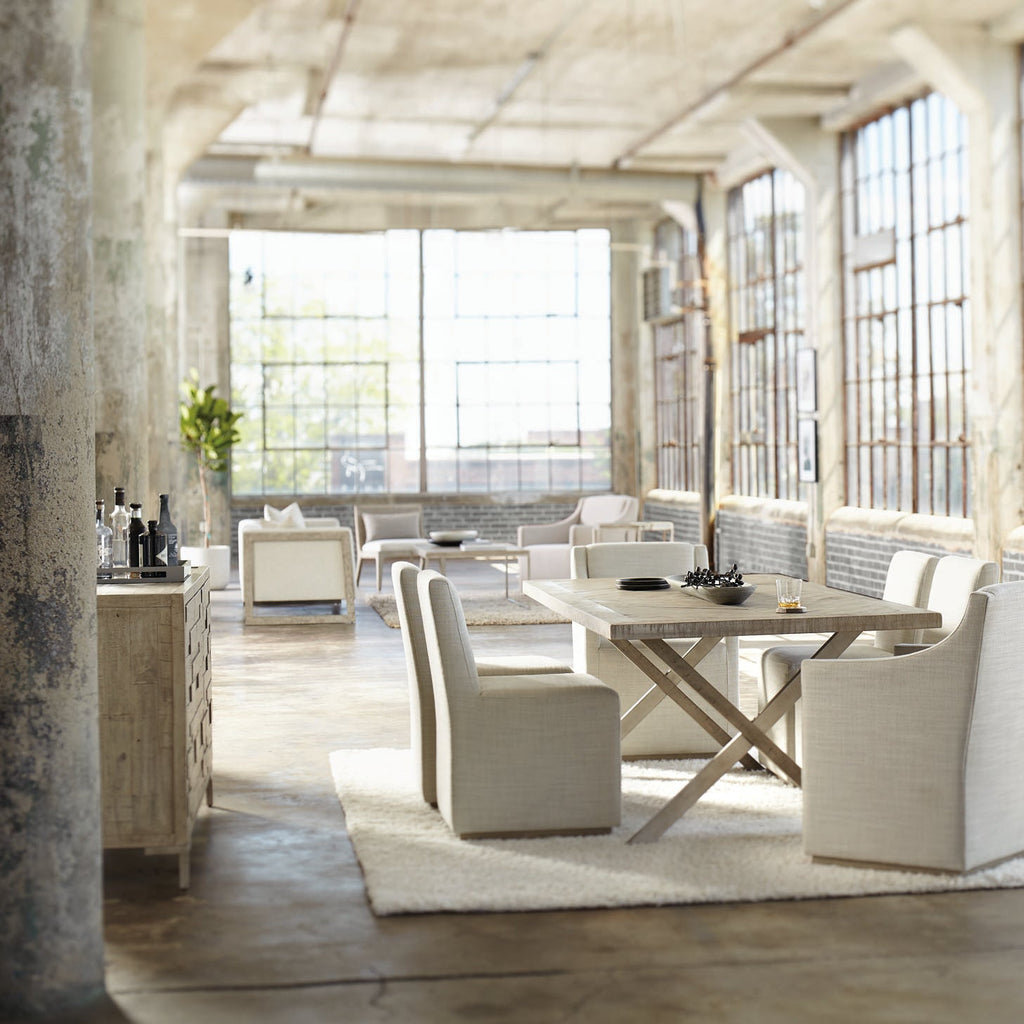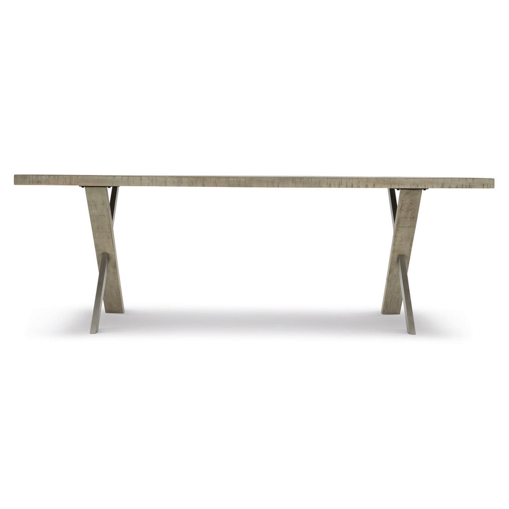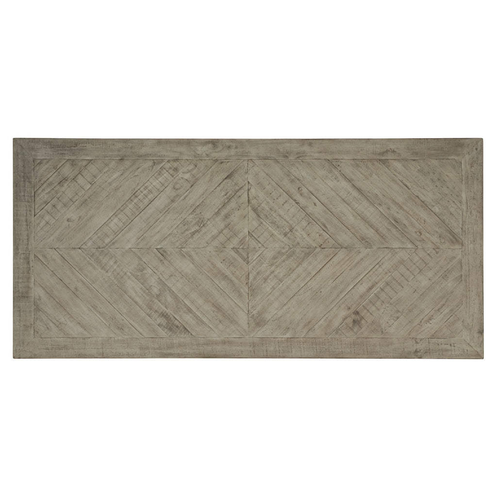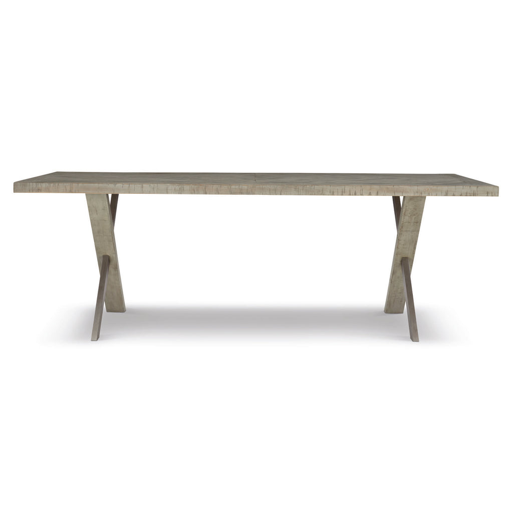 The Highland Park collection delivers eclectic appeal with a laid-back vibe. The Milo dining table takes a modern dynamic approach to rustic farmhouse style. Reclaimed pine planks form a herringbone pattern on the top. The distressed pine is finished in a muted gray Morel, highlighting the grain and imperfections in the wood. Metal legs in a Glazed Silver finish intersect with wood legs on the eye-catching base.