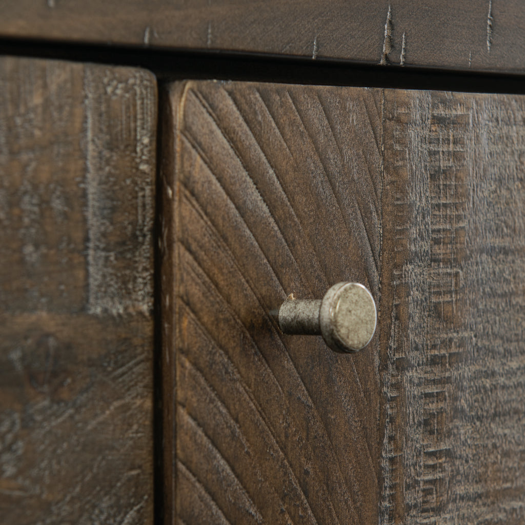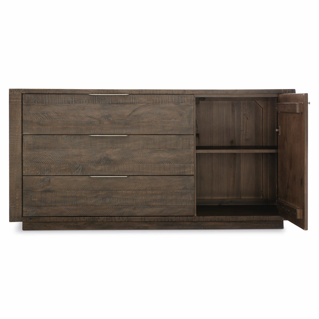 The Payson buffet delivers rustic modern charm. Enhanced by a moody Sable Brown finish, the planked patterns emphasize the different textures and shades of distressed pine. Clean lines and sleek metal tab pulls contribute to the minimalist aesthetic. Casually sophisticated, this sideboard buffet is the perfect solution for storage and style.