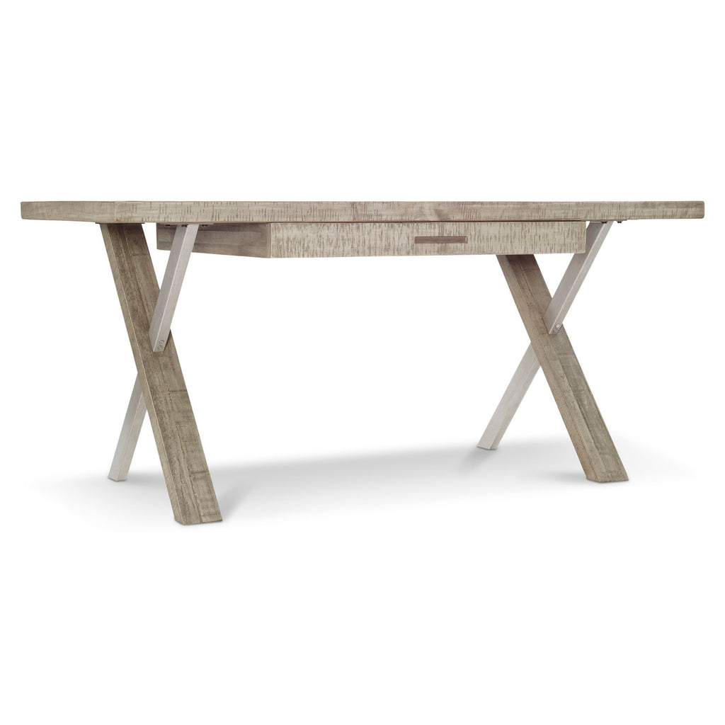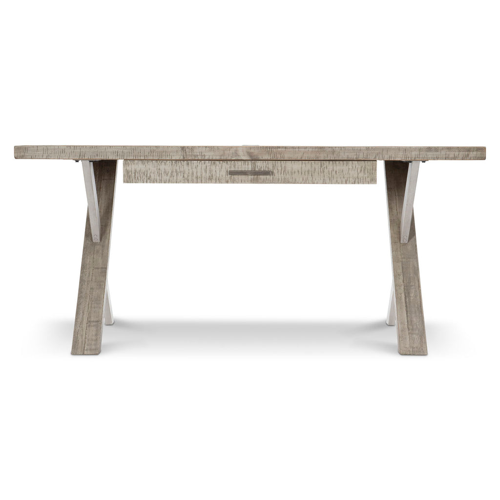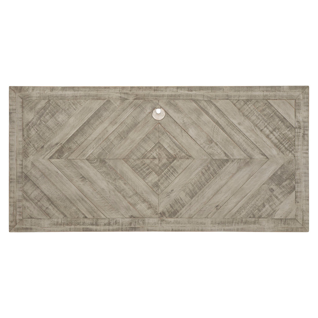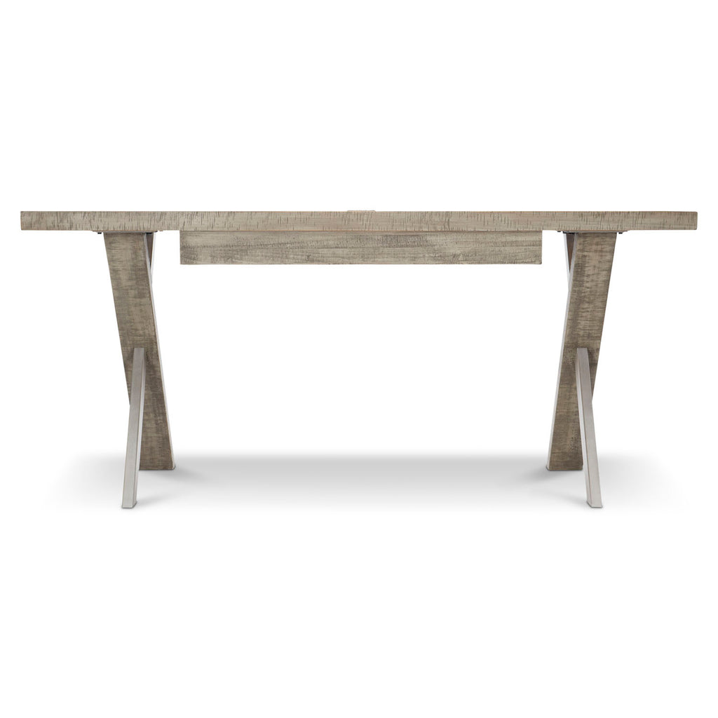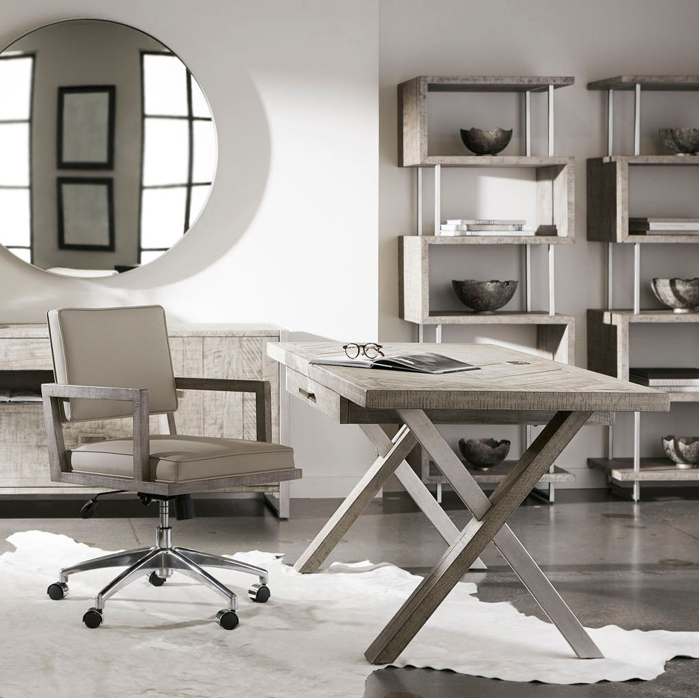 The Polk desk takes a dynamic, modern approach to rustic farmhouse style. The fancy face top features a pattern of reclaimed pine planks. The distressed pine is finished in a muted gray morel, highlighting the grain and imperfections in the wood. Metal legs in a glazed silver finish intersect with wood legs on the eye-catching base.