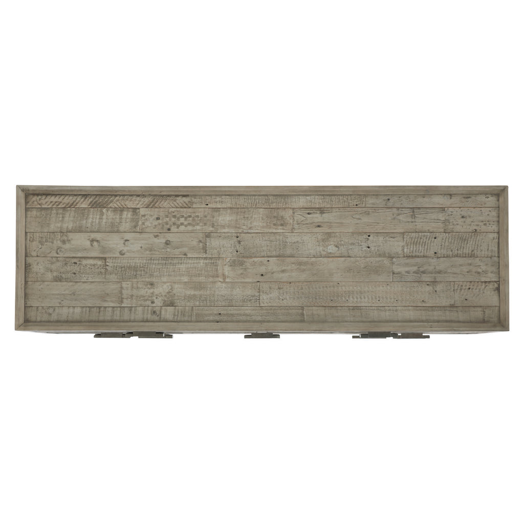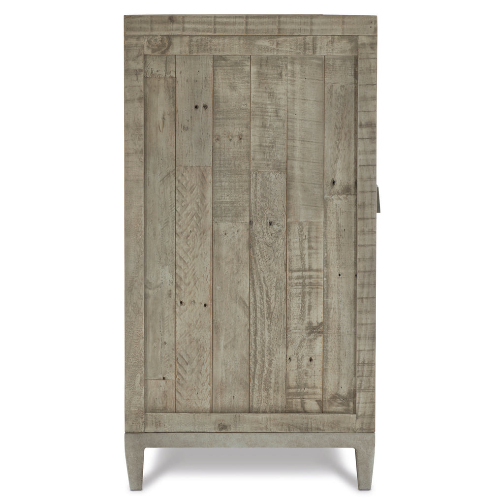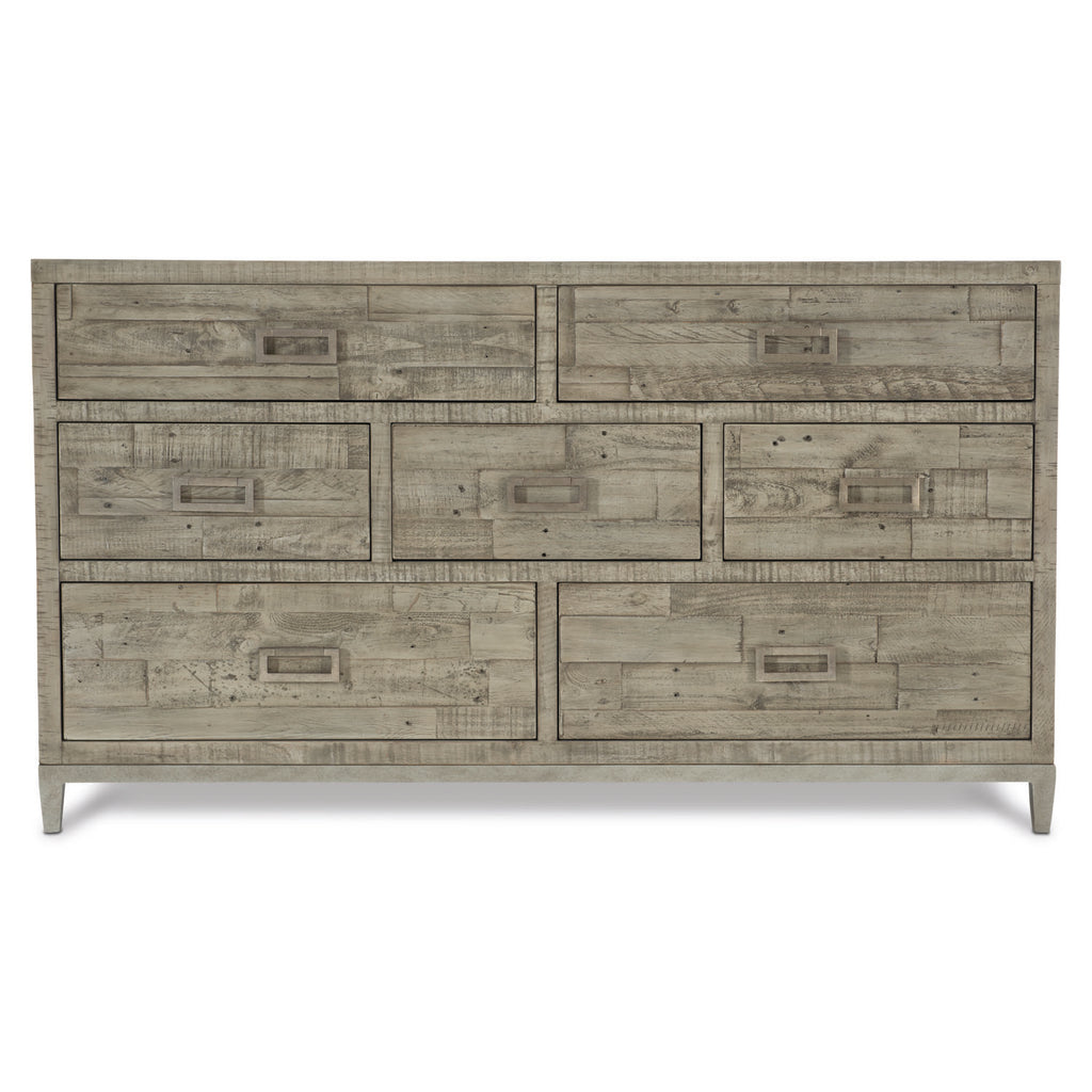 The Highland Park collection blends the best features of mid-century and farmhouse design, delivering an eclectic appeal with a laid-back vibe. The Shaw dresser adds layers of rustic texture to a clean, modern form. Reclaimed pine planks of varying lengths and widths create dimension and lend the feeling of a found object. The distressed pine is finished in a muted gray Morel, highlighting the grain and imperfections in the wood.