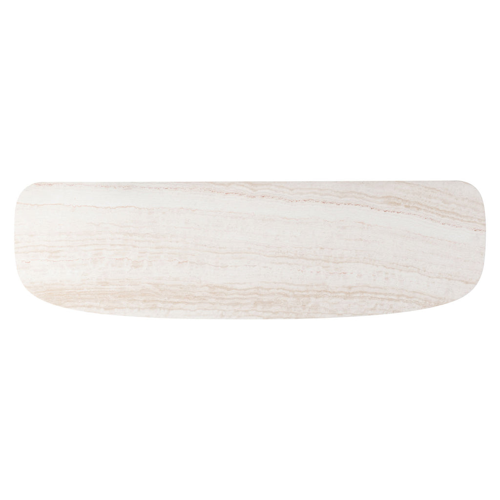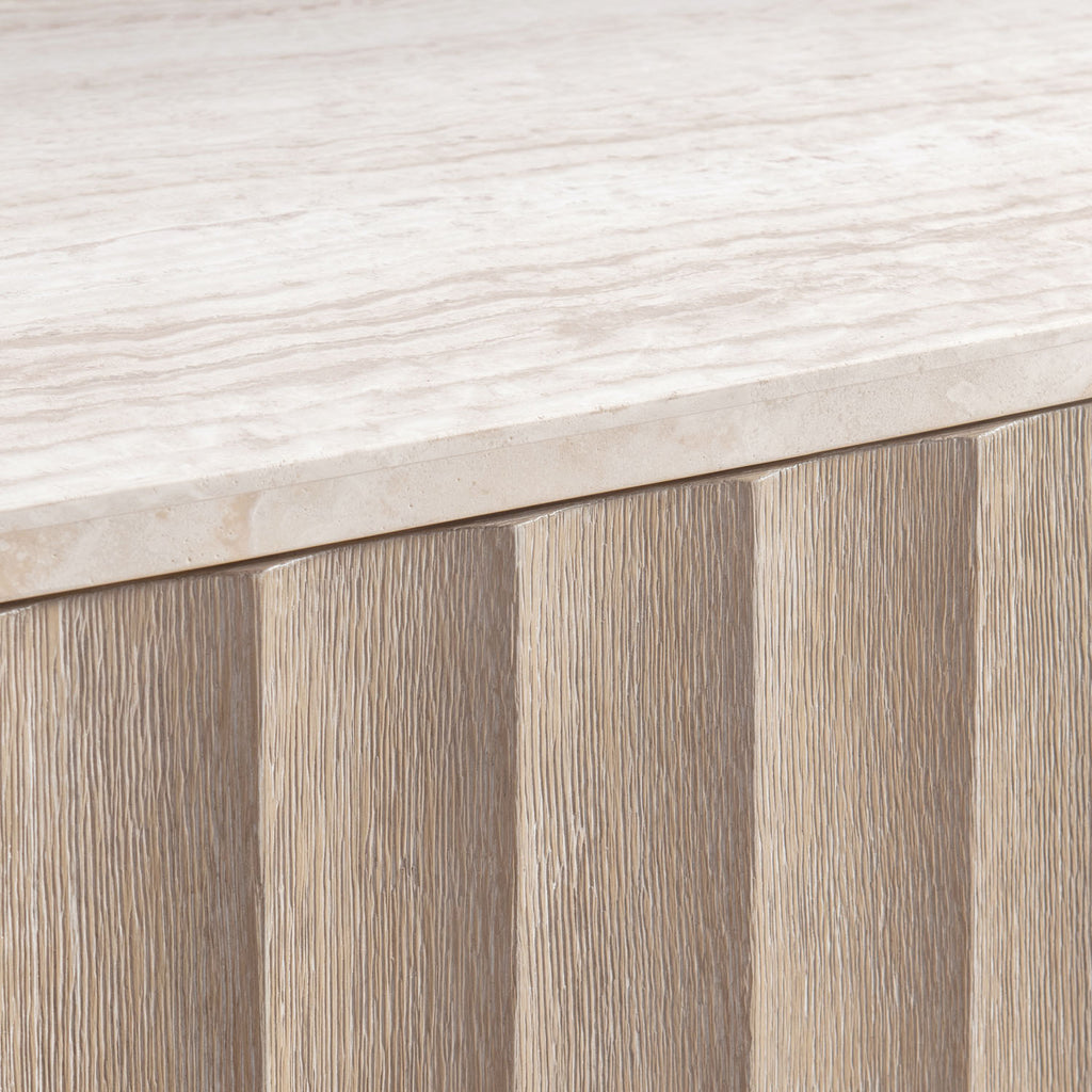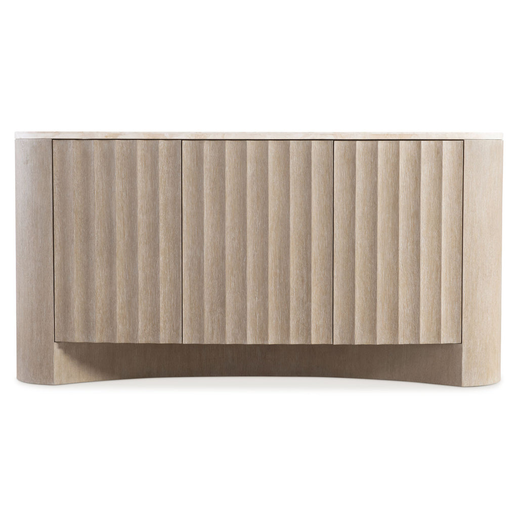 The Loggia buffet patterns contrast and dimension with stunning fluting on its three push-to-open doors. Finished in Aria, the case sits on a shapely concave plinth and supports a travertine stone top with rounded corners. The doors open to reveal adjustable shelves and a center drawer.
