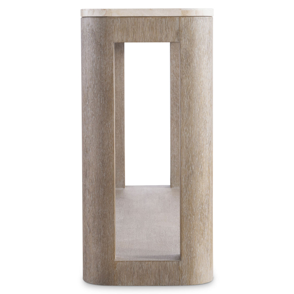 The Loggia console table uses simple lines and curves to craft a uniquely modern form. The supports are gently rounded, complementing the curved corners of the travertine stone top. The textured wood in Aria finish creates dimension.