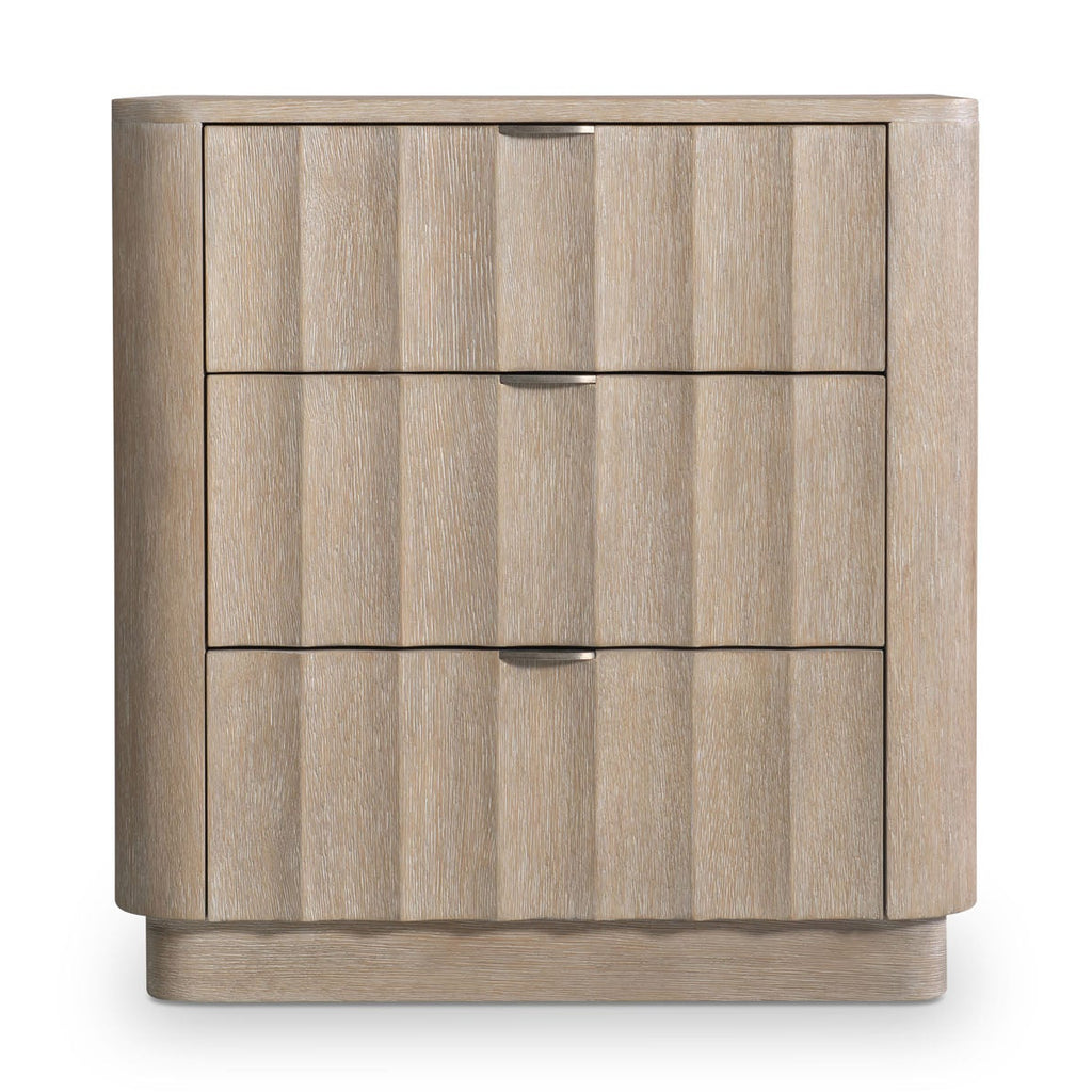 The Loggia nightstand patterns contrast and dimension with stunning fluting on its three drawer fronts. Finished in Aria, the case sits on a plinth base and supports a wood top with rounded corners. The drawers feature metal tab pulls finished in Laurion. A two-port A+C USB charging unit is also included.