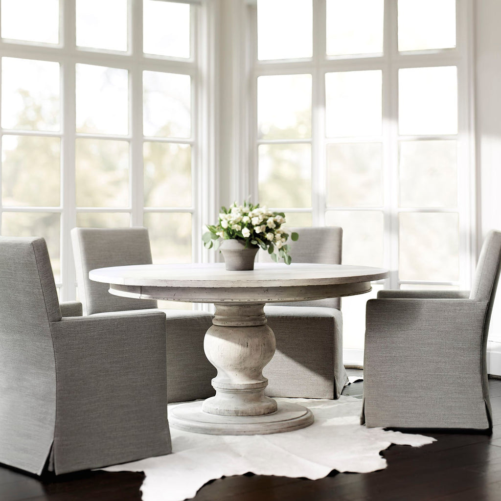 Inspired by 17th century French Provincial furnishings, Mirabelle balances traditional forms with casual style. The focal point of the Mirabelle dining table is its turned pedestal base, refined and softened by a gently worn whitewashed finish. The casual Cotton finish combines with graceful curving lines for a look that is sophisticated and dressy, yet relaxed and inviting.