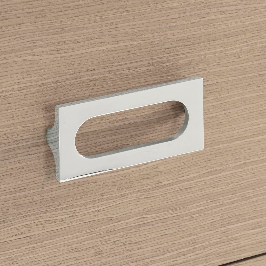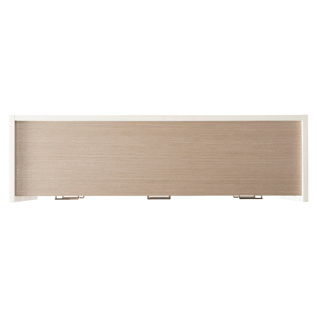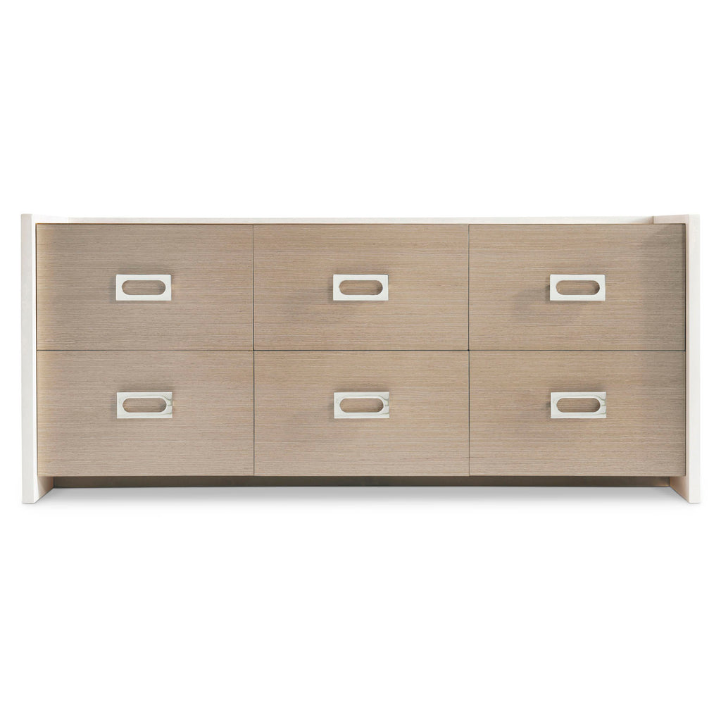 With its design inspired by midcentury modern styles, the Modulum dresser is finished in Sahara with a center case that floats between white Adobe side panels. A gallery rail around the top is also finished in Adobe. Six soft-close drawers are highlighted with metal hardware that has a distinctly retro design.
