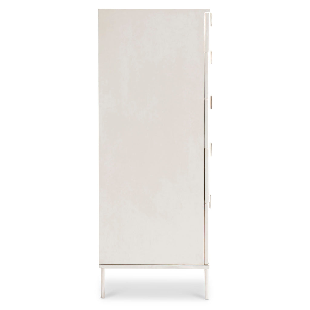 A quietly elegant design, the Modulum tall drawer chest features cast resin fluted shaping across the five soft-close drawer fronts. Finished in a white Adobe faux stone, the case sites on a polished stainless steel base that complements the sleek door pulls.