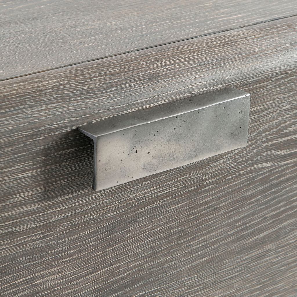 The Monolith dresser has a distinctive modern style with an offset vertical post between two sections set on plinths. On the left are two deeper soft-close drawers with cast aluminum tab pulls in Graphite finish. On the right are three longer drawers with the same beautiful hardware. The overall design has a deeply textured look in Puma finish.