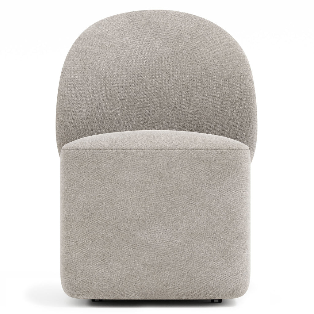 A rounded and curved back panel makes a bold statement on the Monolith side chair. It appears to float as it nests gently against the shaped and upholstered base. Hidden casters provide a smooth movement to and from the table.