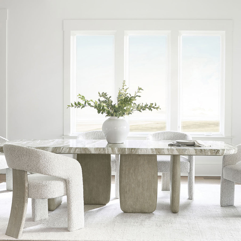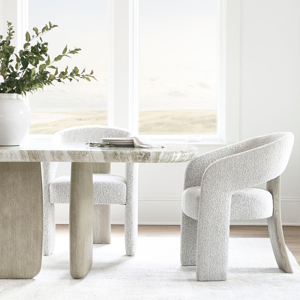 The Arcadia arm chair showcases relaxed, modern style, with an open back that curves around to form the front legs. The seat floats in the center, highlighted by a wood panel in Clay finish that crafts a third leg on the back. The wire-brushed wood complements the texture of the fabric.