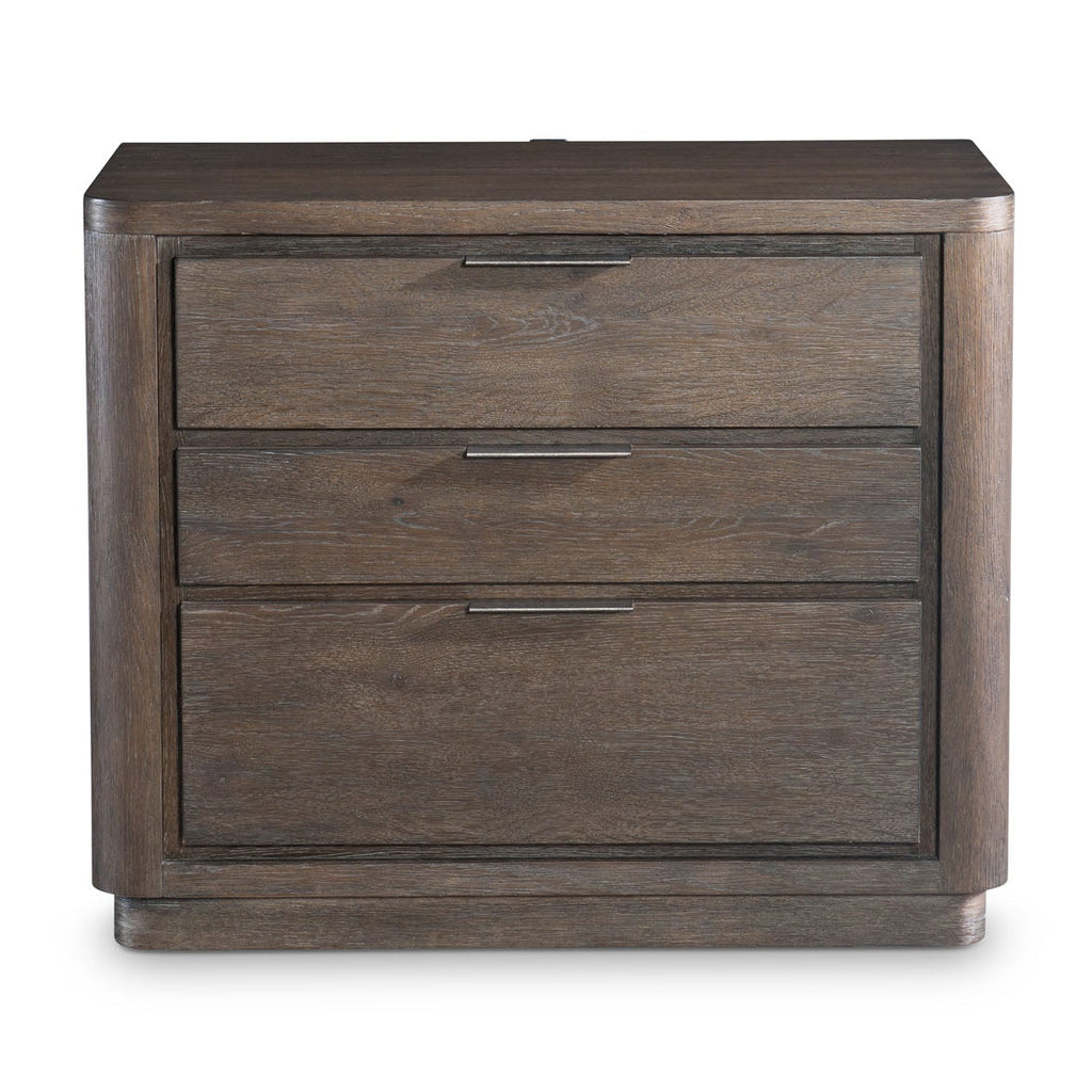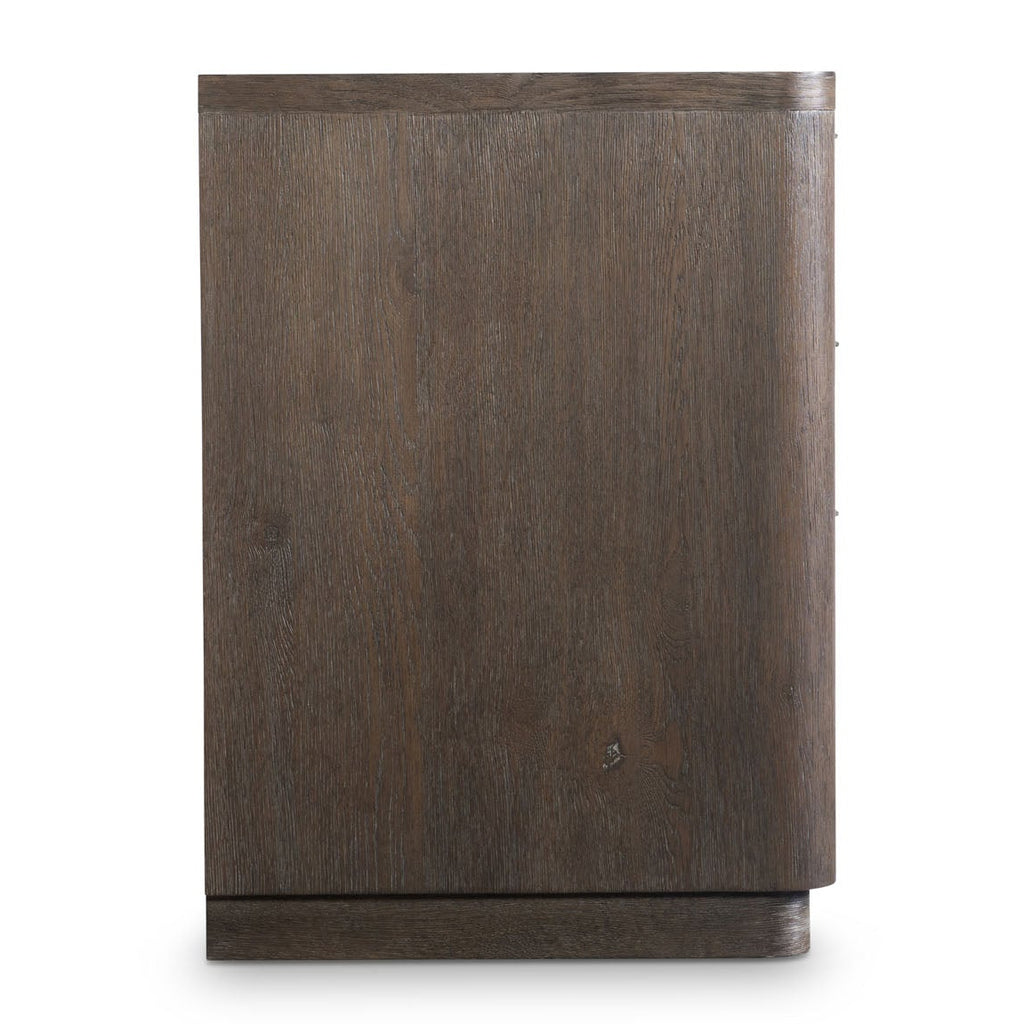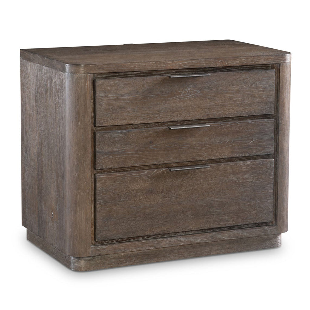 Recessed detailing defines the three drawers on the Outline nightstand. Varying drawer sizes create a geometric visual style, while natural wood grain and metal pulls balance an organic look. The design, resting on a plinth base, is finished in Cassel.