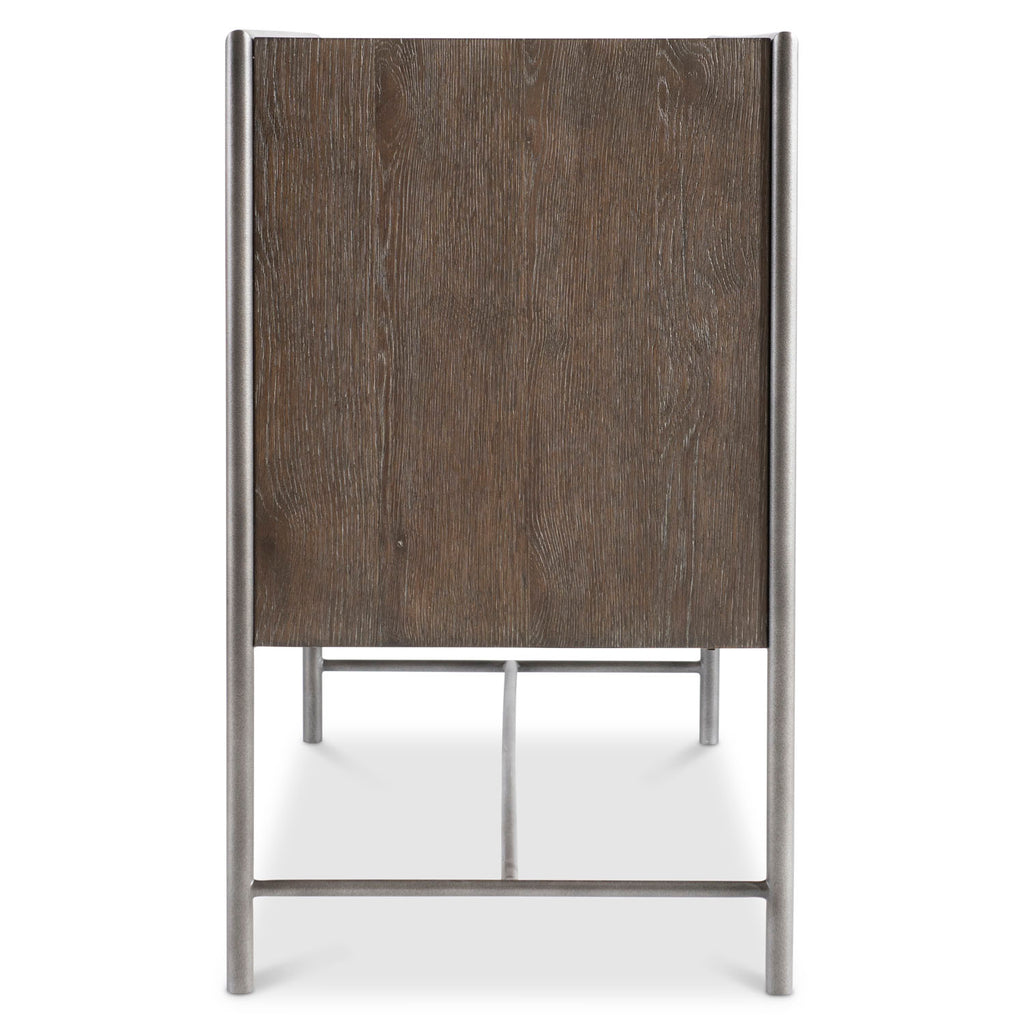The Outline buffet balances negative space and modern lines for an elevated design. The metal frame defines sleek lines by tracing the outer edges of the wooden case. Three push-to-open doors reveal adjustable shelves and two drawers. Finished in Cassel, the look is casual yet sophisticated.