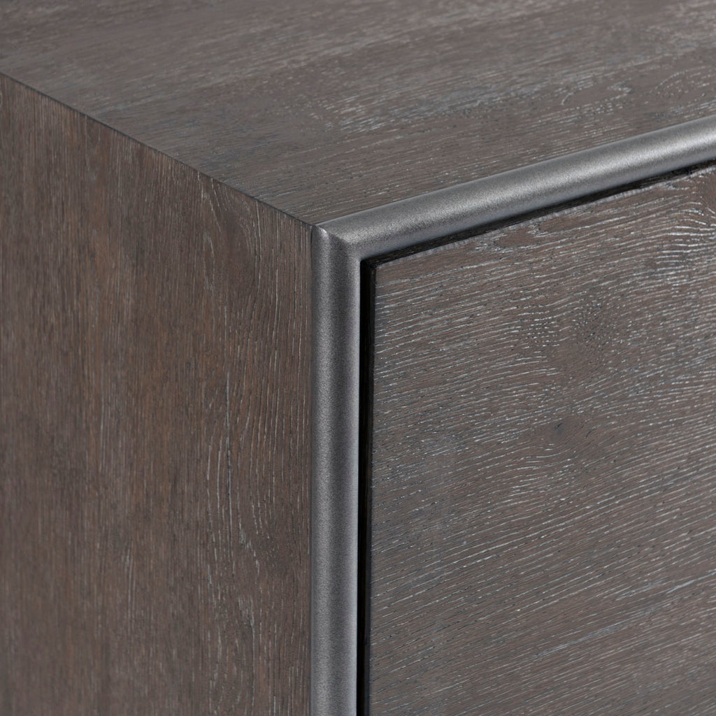• Wire-brushed oak in Kohl finish with applied textured steel frame in Atra finish