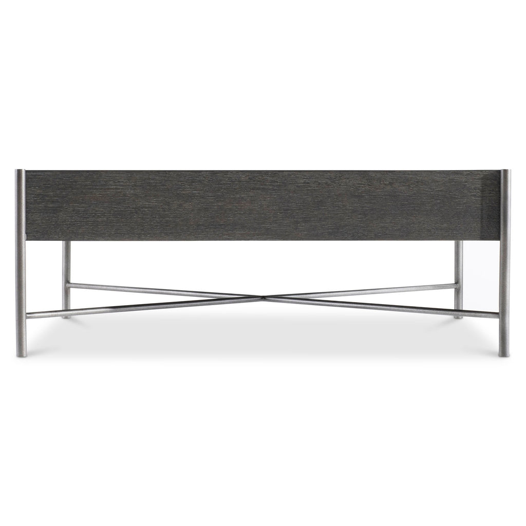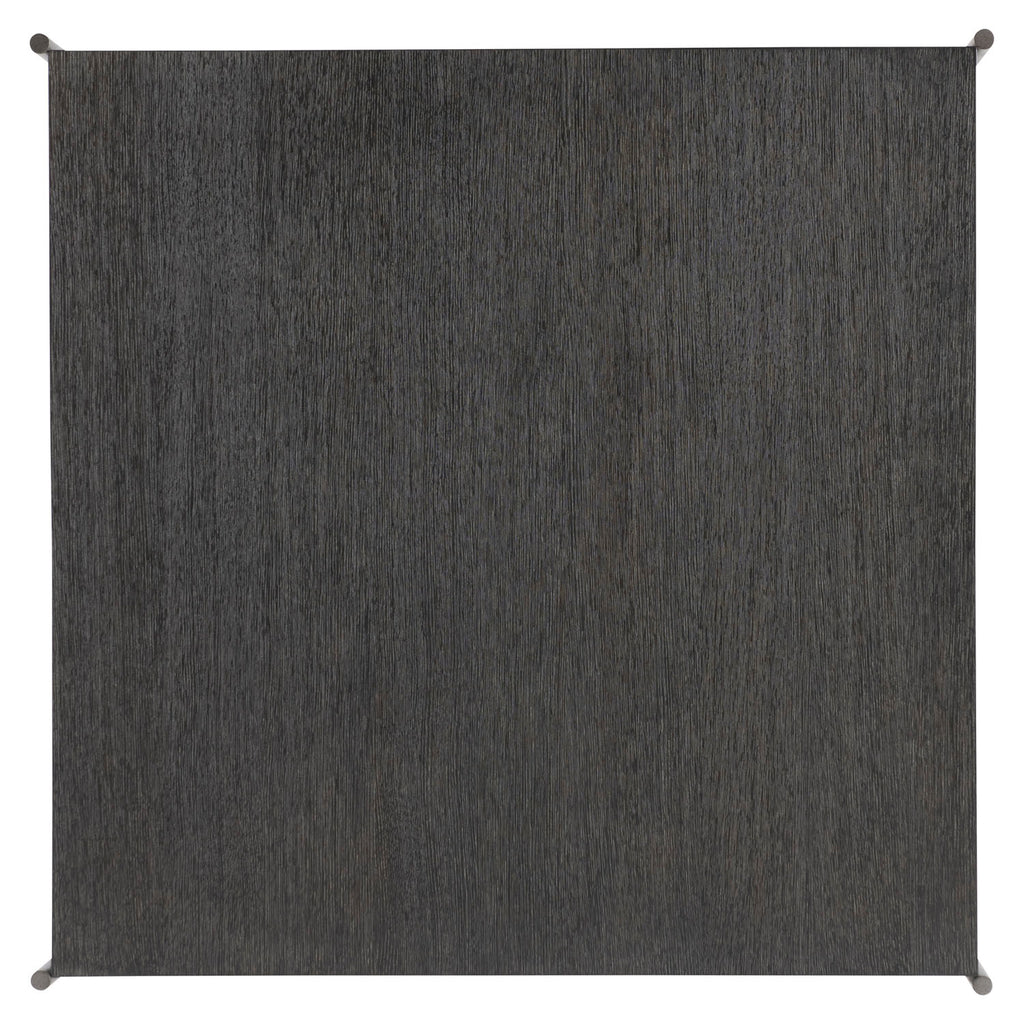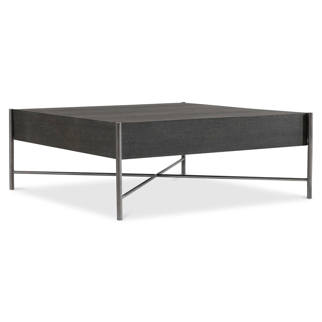 The Outline cocktail table has a sleek metal frame that includes slim pillars that support each corner. The top appears to float above the x-shaped stretcher, giving a lightness to the solid form. The wood is finished in a deep Kohl while the metal glows in Atra.