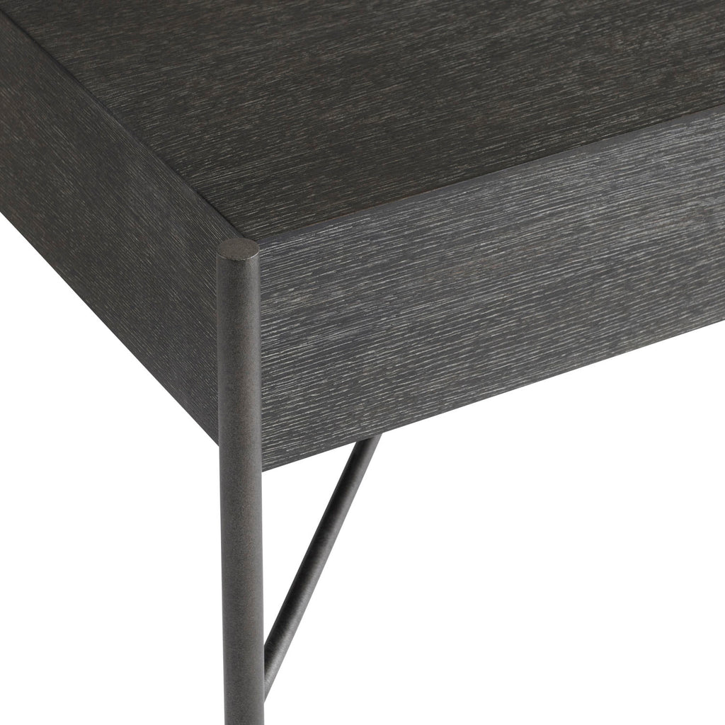 • Wire-brushed oak in Kohl finish with applied textured steel base in Atra finish