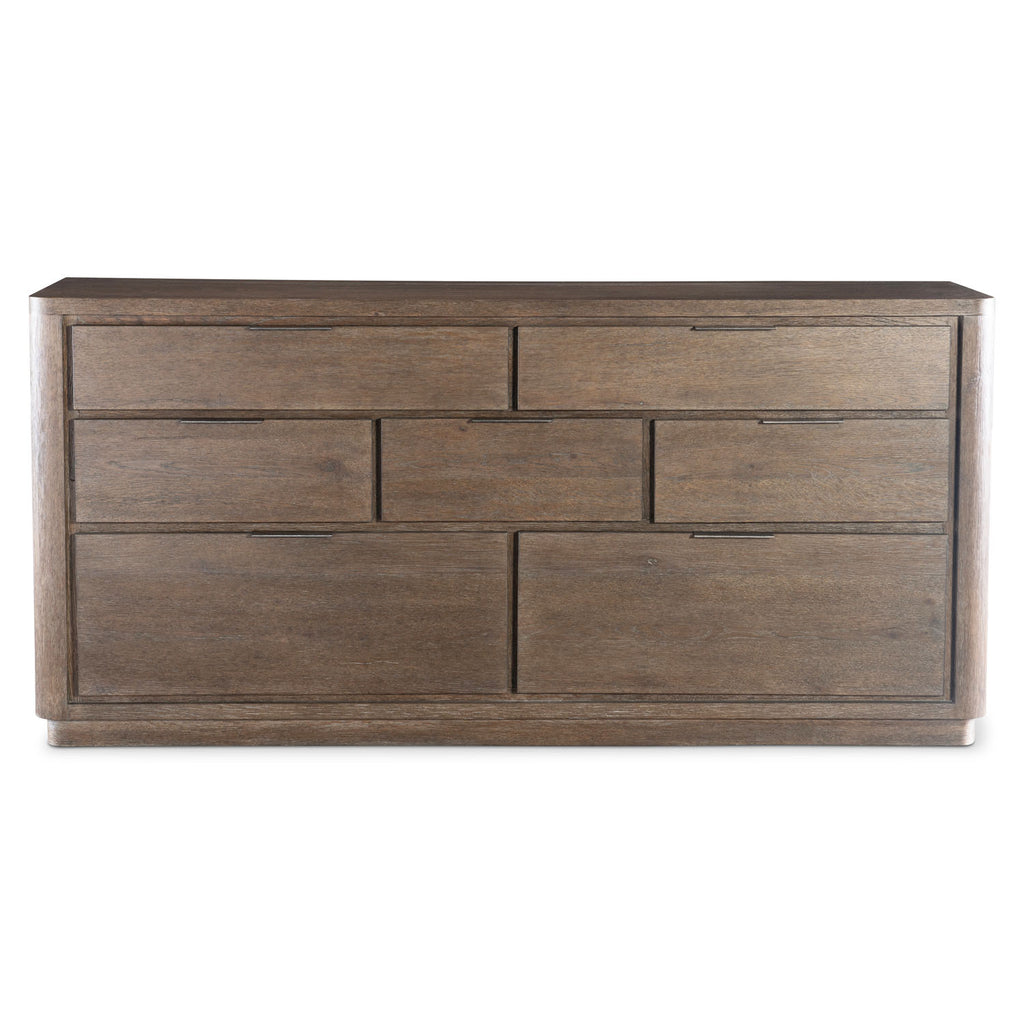 Recessed detailing defines seven drawers on the Outline dresser. Three drawer sizes create a geometric visual style, while natural wood grain and metal pulls balance an organic look. The design, resting on a plinth base, is finished in Cassel.