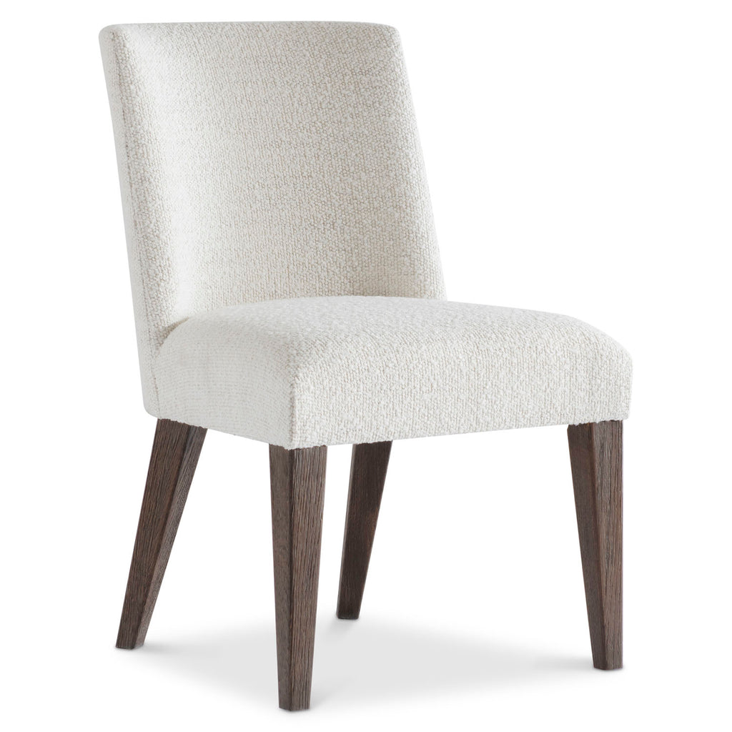 Streamlined modern style is perfectly designed in the Outline side chair. The sleek silhouette seems simple but has a sophisticated focus with tight upholstery and softened lines. The exposed wood legs are finished in Cassel.
