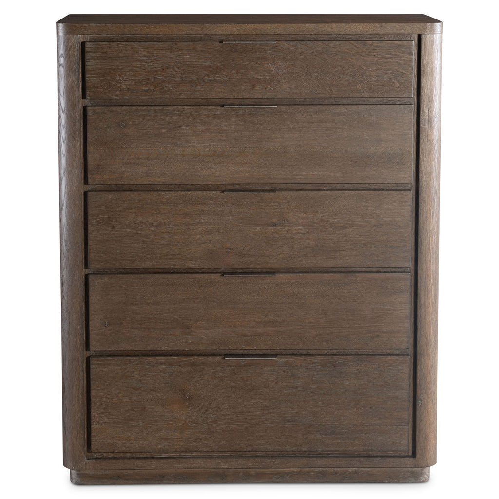 Recessed detailing defines the five drawers on the Outline tall drawer chest. Varying drawer sizes create a geometric visual style, while natural wood grain and metal pulls balance an organic look. The design, resting on a plinth base, is finished in Cassel.