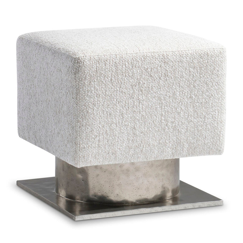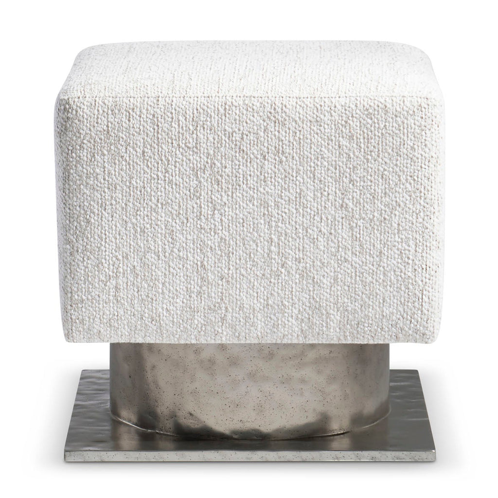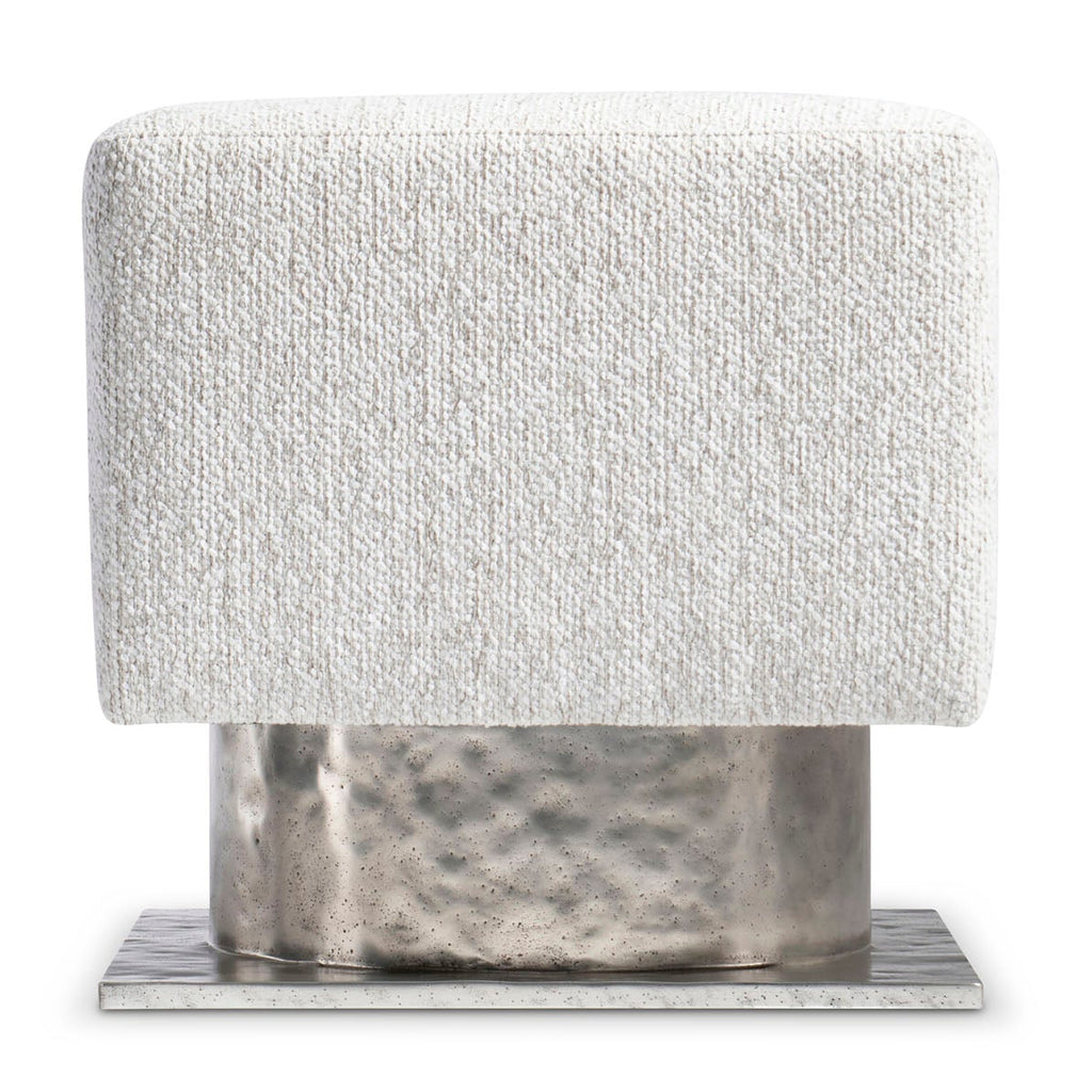 The Prado bench design is inspired by modern architecture, with a square upholstered seat floating above a metal base. The base is formed with a round textured cast aluminum pedestal and square plinth finished in Bright Graphite.