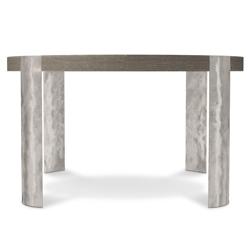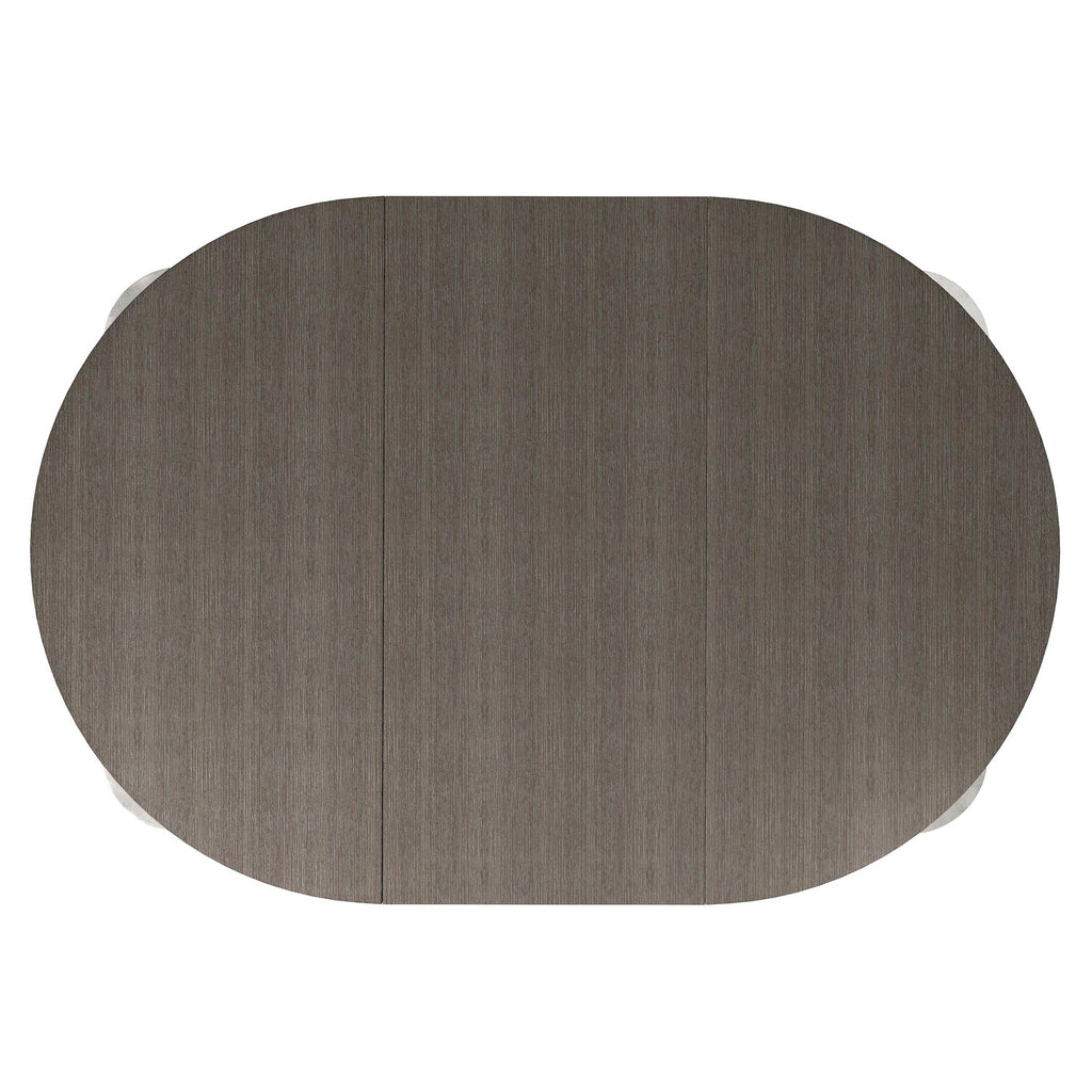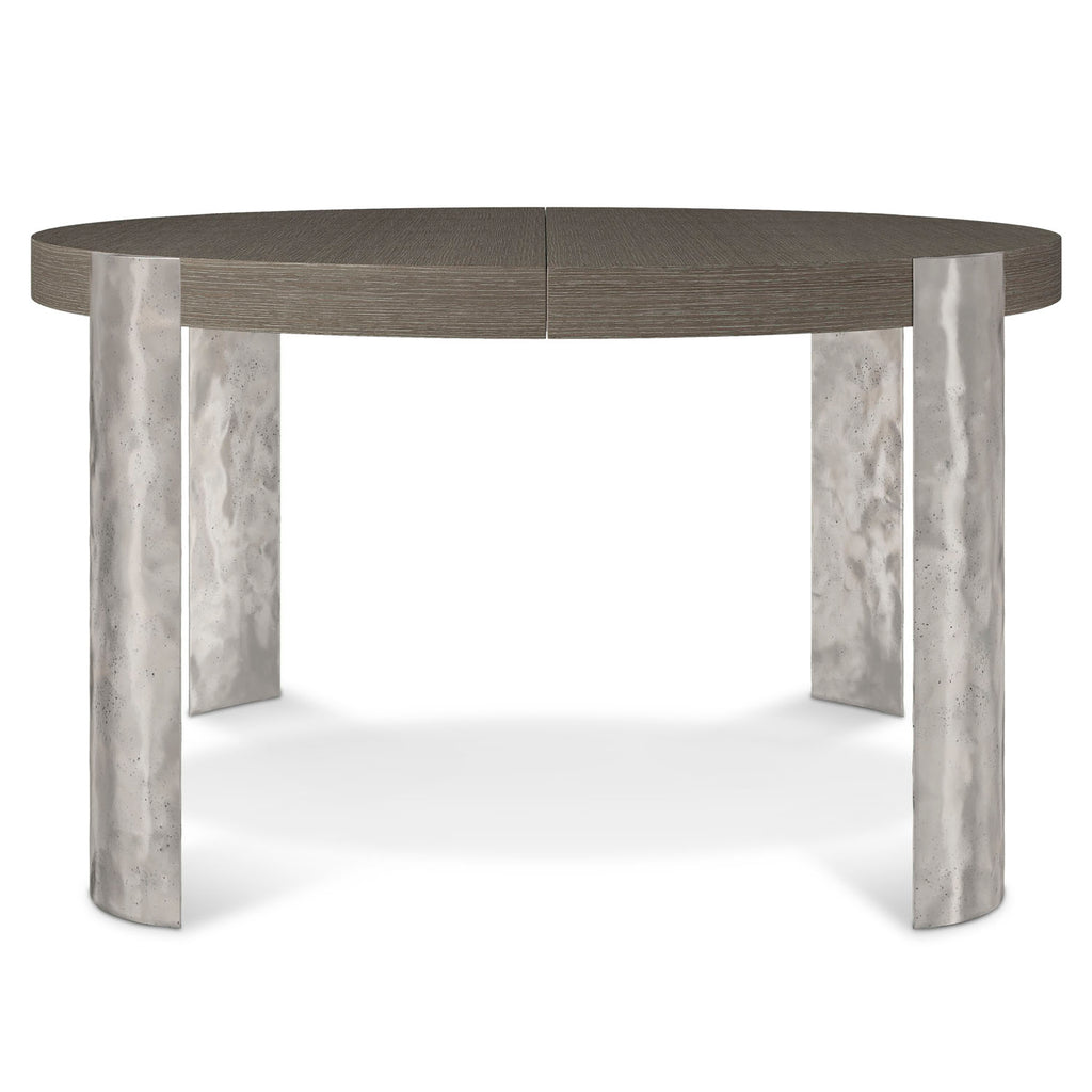 Mixed materials and texture create a modern rustic look for the Prado dining table. Four shaped cast aluminum legs in Bright Graphite finish support and surround the round wood top in a Porcini finish. The table expands to an oval shape with the addition of one leaf.
