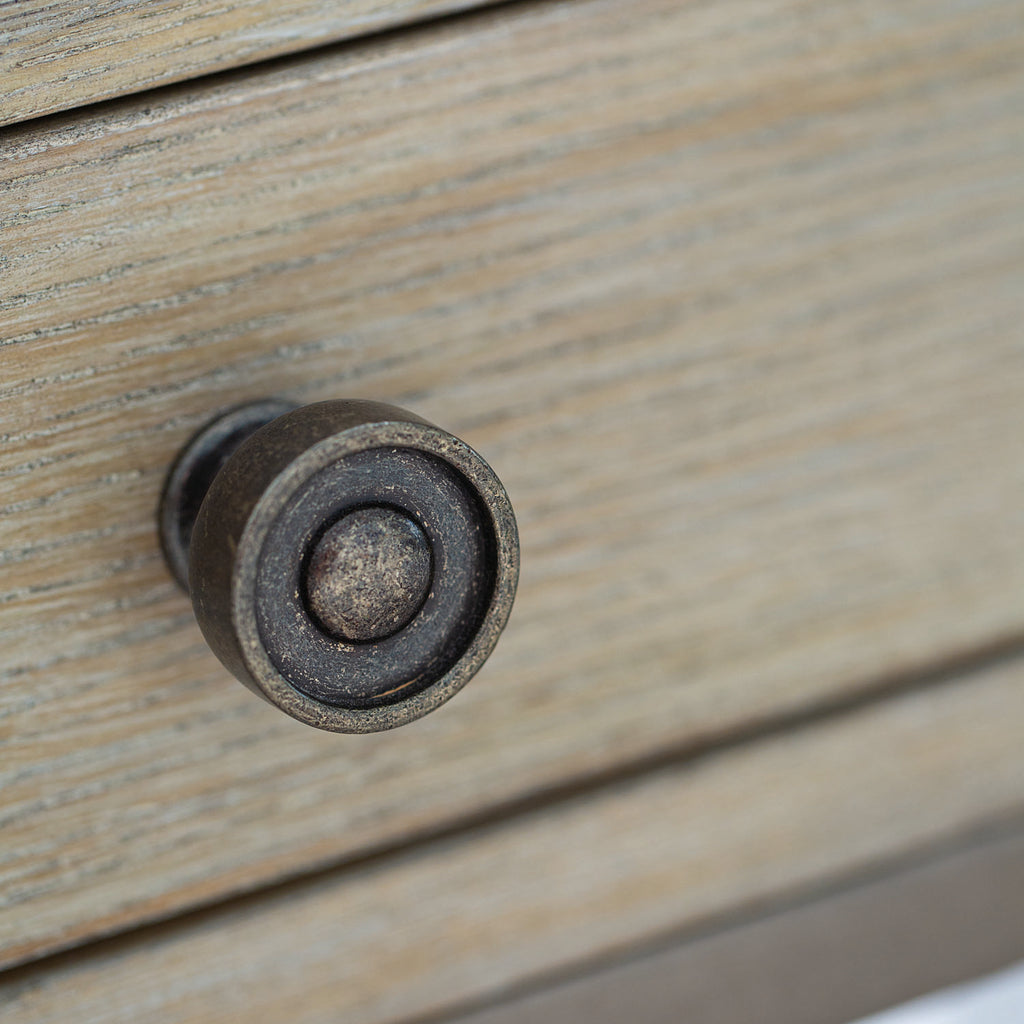 The Santa Barbara console table offers a fresh take on a traditional form. The simple, elegant design features a welded stainless steel base with eight slender, tapered legs with square feet. Oak veneers have been wire-brushed and cerused, which gives them subtle textures and lighter strokes of color in the grain. A Sandstone finish delivers a polished yet casual feel, while a Vintage Nickel finish on the steel base is tinted for an aged look. Three drawers and an inset tempered glass shelf allow for storage and display.