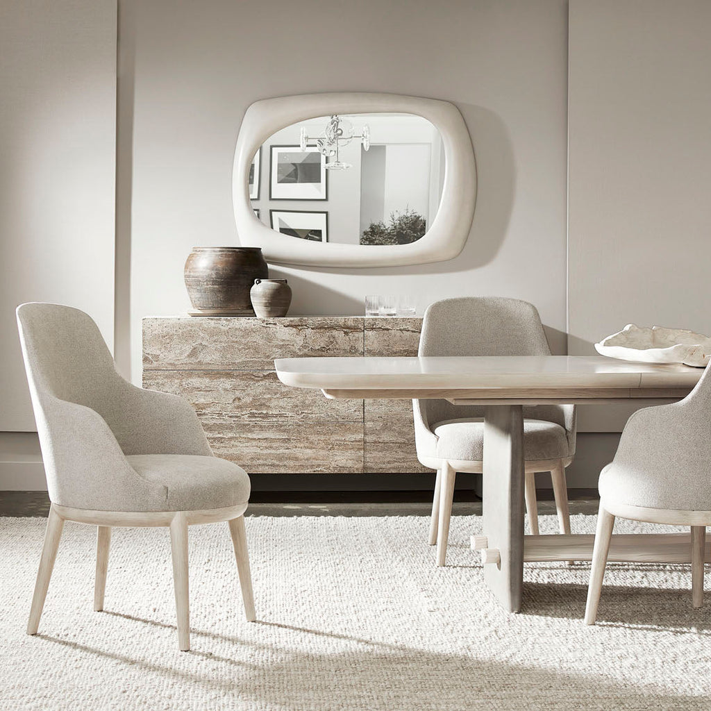The Sereno arm chair offers simply curving shapes for the back and arms of its upholstered seat. A round wood base is complemented by the lines of its legs, all of which is finished in Lutra. The look is both casual and modern, elegant and restrained.