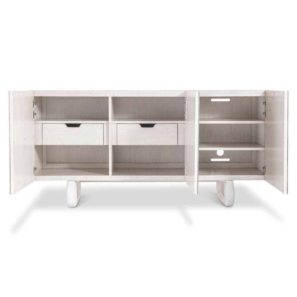 Rustic cast aluminum offers visual interest and dimensional texture on the Sereno buffet. The sides and top are walnut finished in Lutra, with the metal fronts featured on three push-to-open doors. Cast resin open-work legs have a faux stone texture in the Lutra finish. Storage includes fixed and adjustable shelves and two drawers.