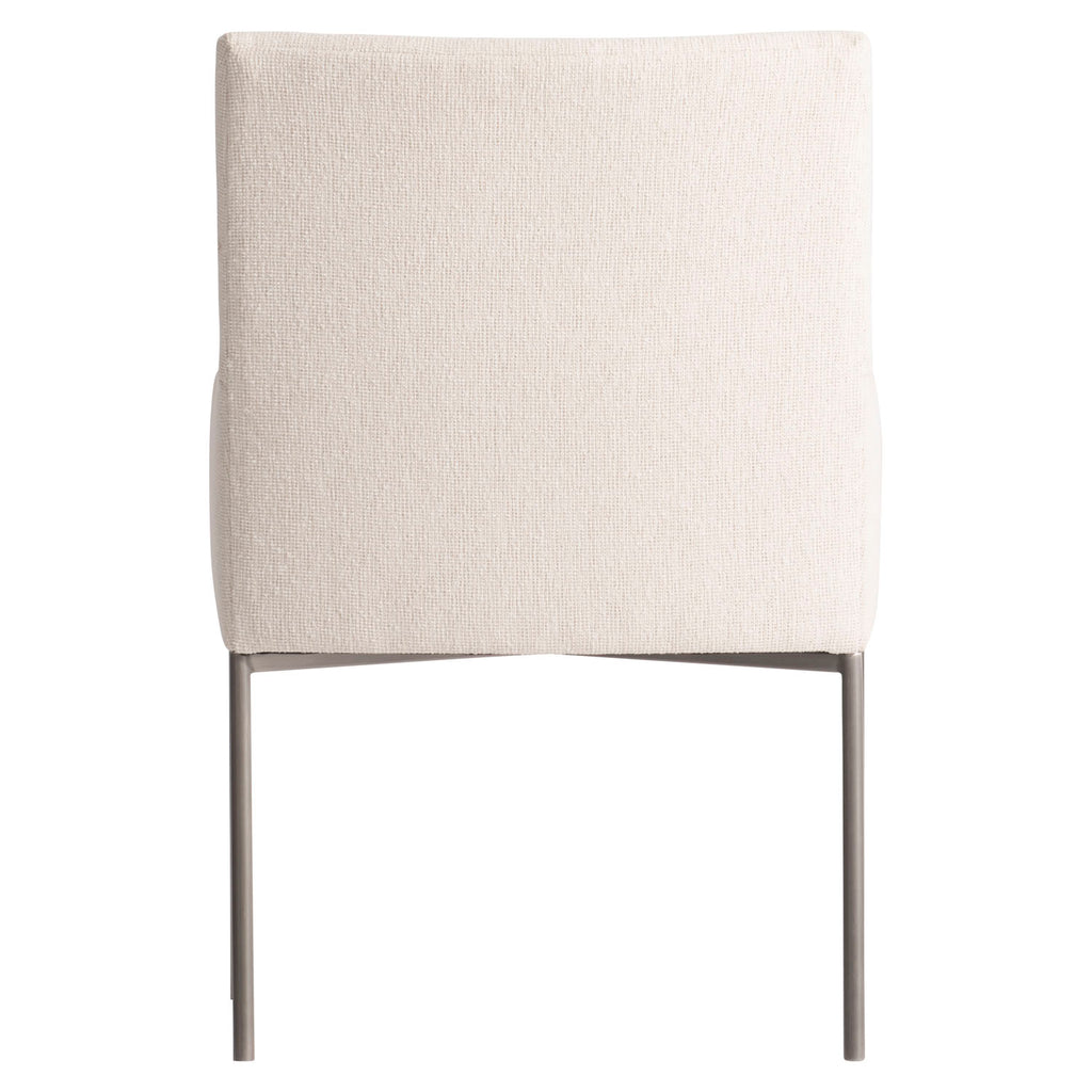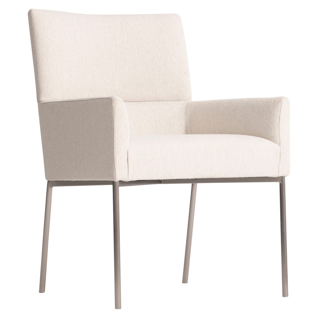 Minimalist design offers an elevated style for the Sereno arm chair. The upholstered seat has softly tapered arms and an elegant seaming across the back. It's supported by a metal base of brushed stainless steel metal in Nickel finish.