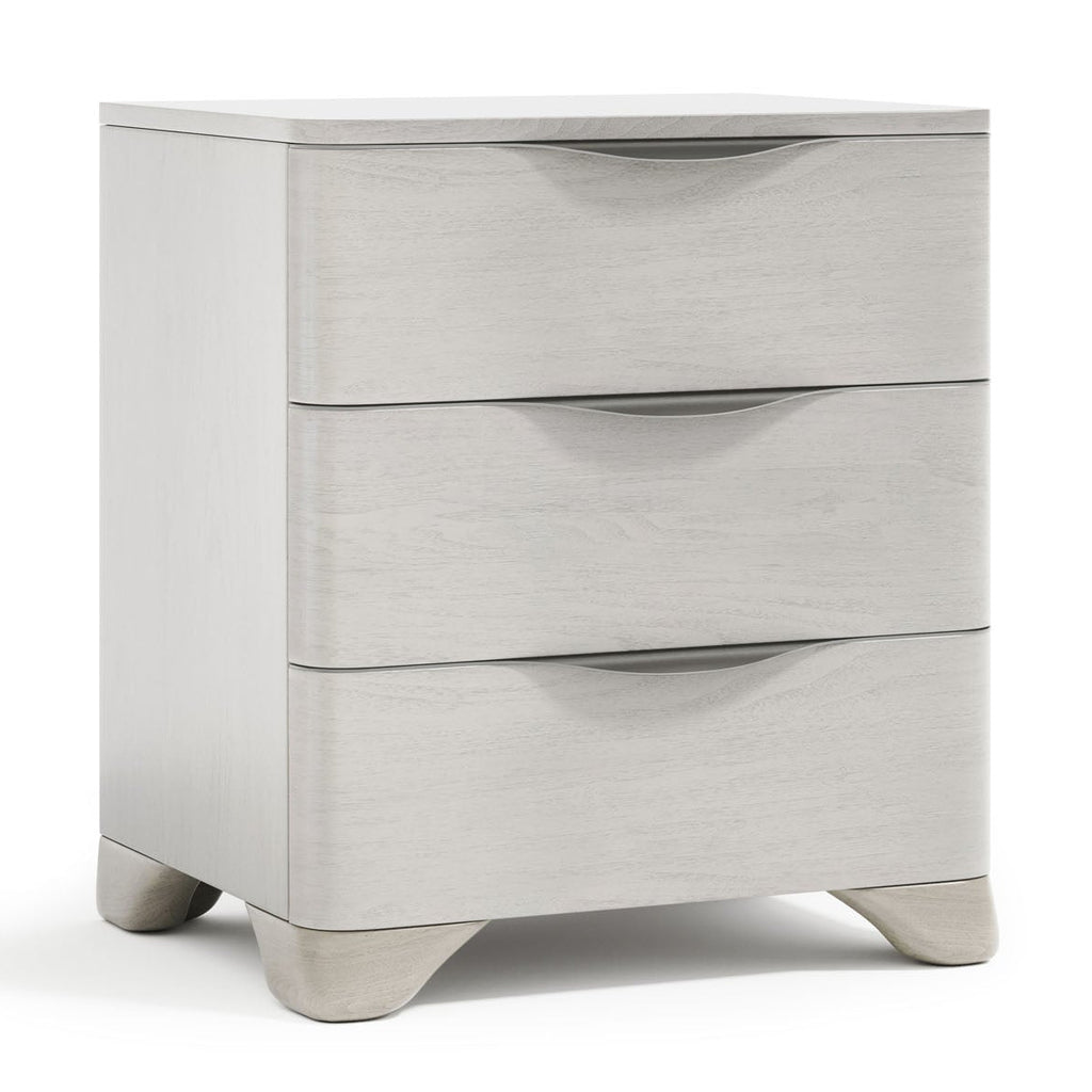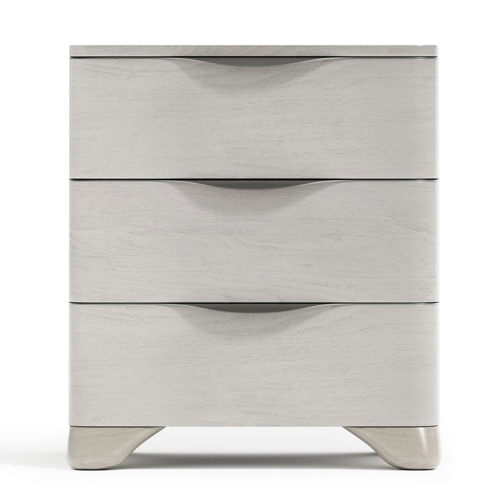 Simple lines are redefined with a modern style in the Sereno nightstand. Three soft-close drawers offer full length brushed stainless steel pulls that curve with a sinuous style that adds dimension. Modern technology is offered with a two-port USB charging unit.