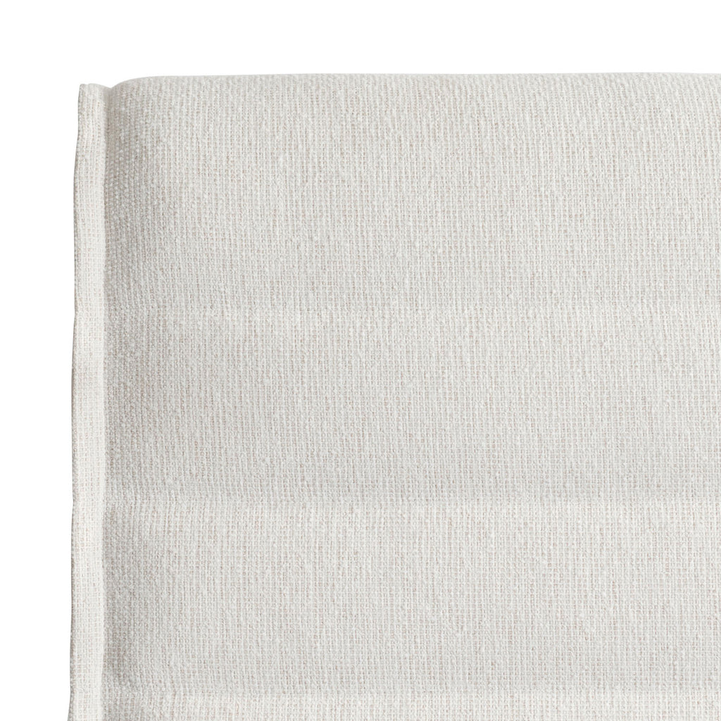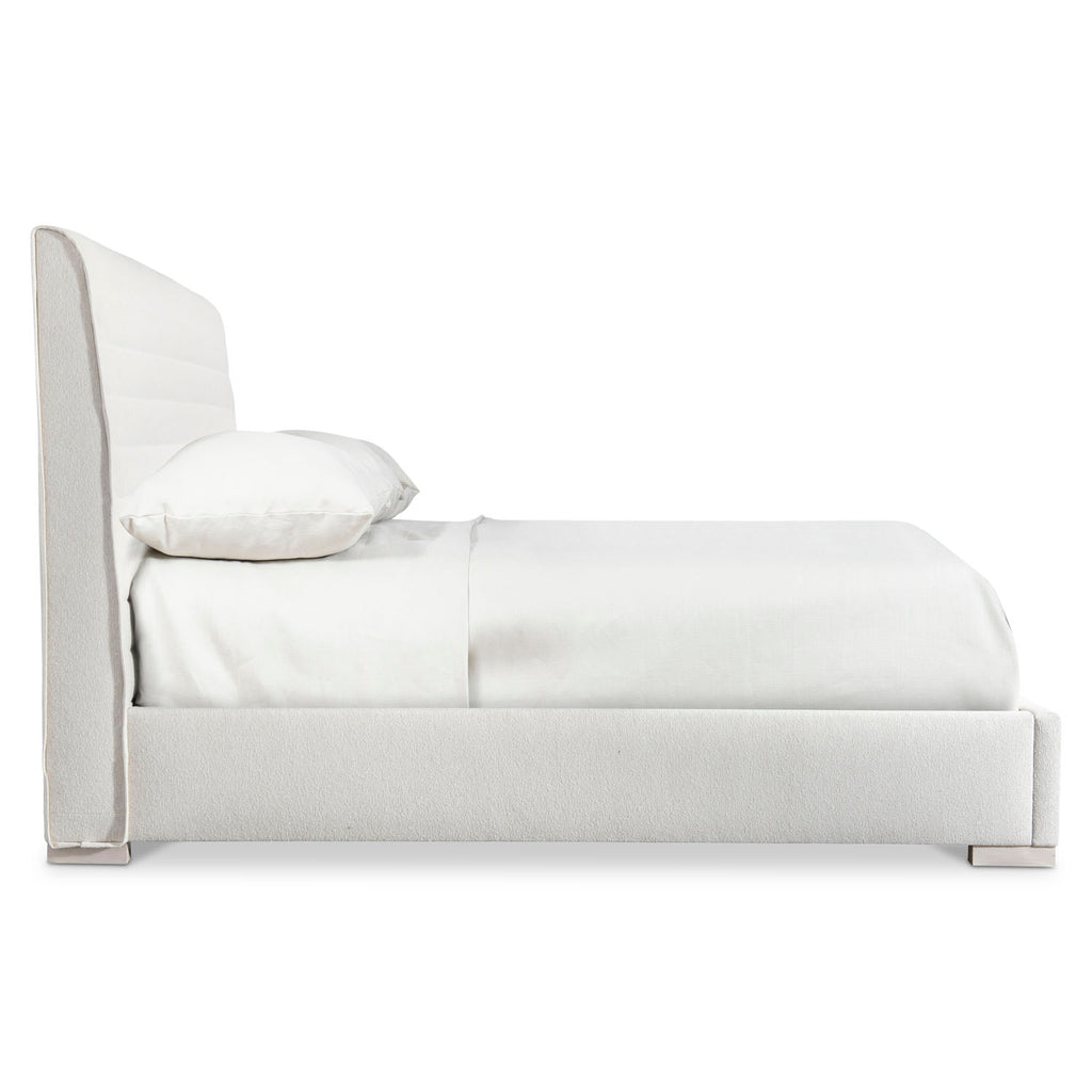 The Sereno panel bed is clean and organic with softened edges and a simplified form. The frame is fully upholstered with horizontal channels for chic comfort. The side panels on the headboard offer unique shaping with flanged edges.