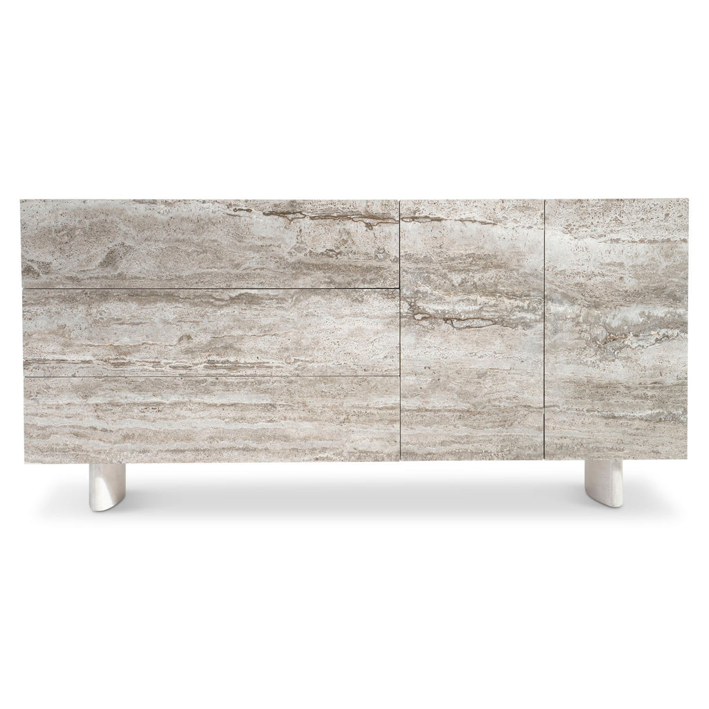 The luminous beauty of stone and textural wood are beautifully balanced in the Sereno buffet. The top and sides are crafted in walnut with a Lutra finish, while three drawers on the left and two doors on the right gleam in silver travertine fronts. The modern organic design is finished with two cast resin legs with a faux stone texture.