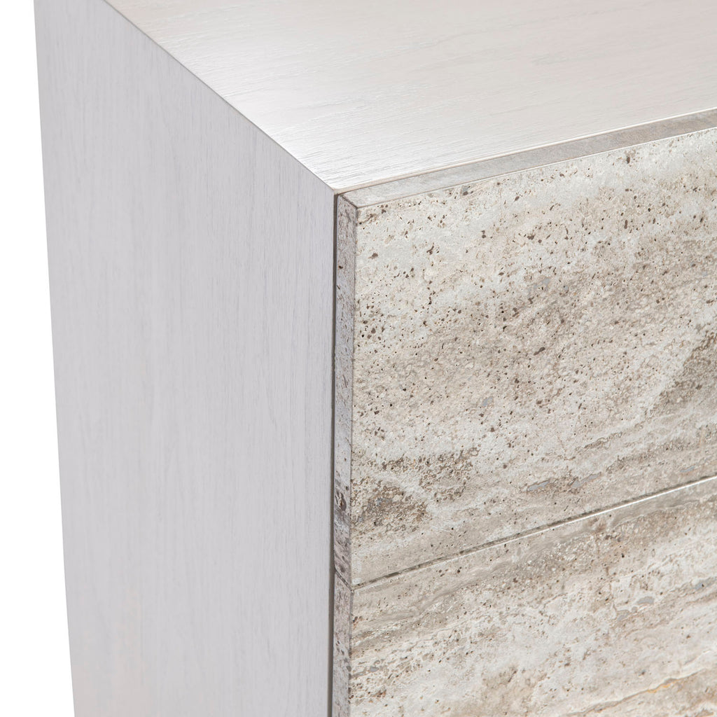 • Walnut wood case in Lutra finish with silver travertine door and drawer fronts atop cast resin legs in Lutra Faux Stone finish