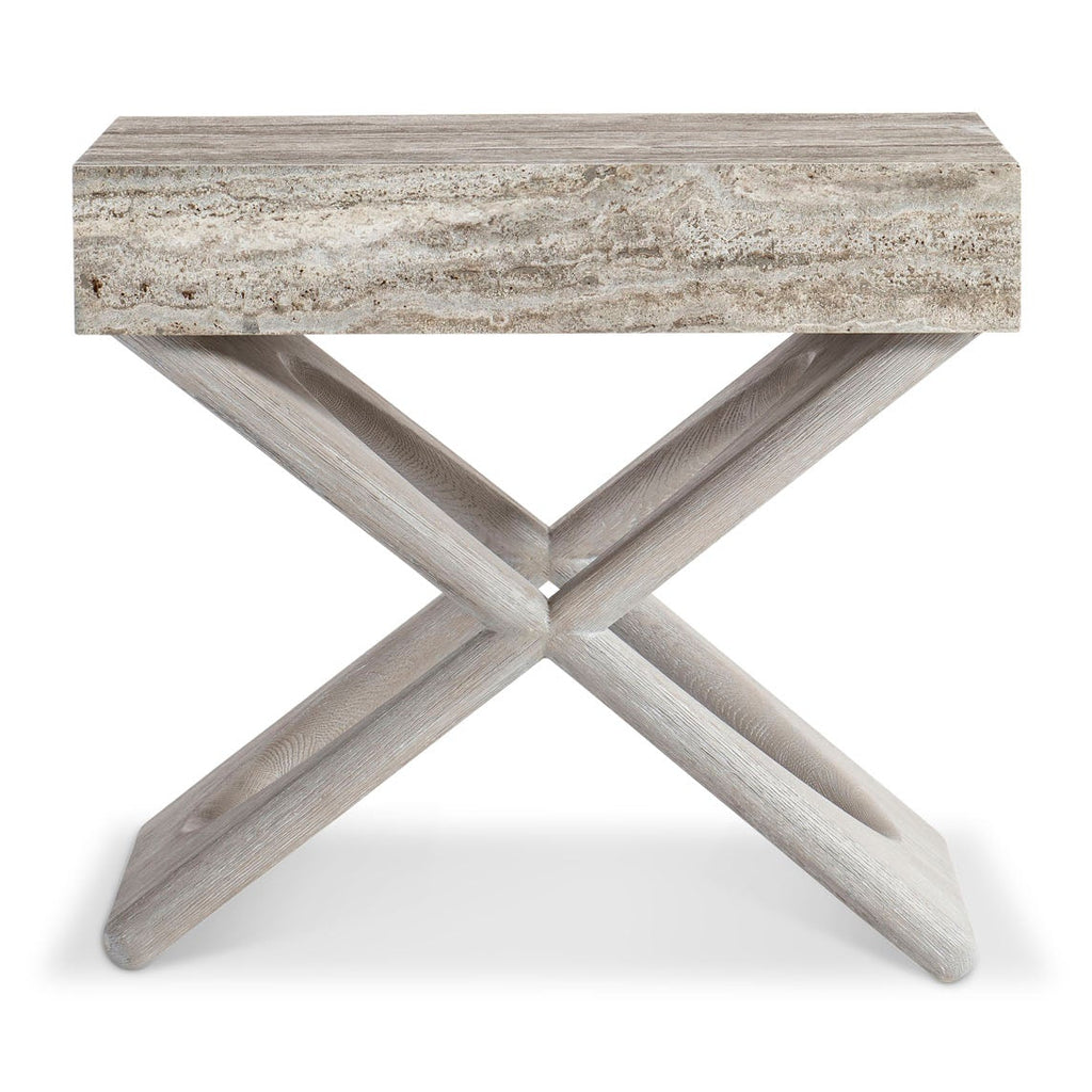 The X-shaped base on the Sereno nightstand offers a sophisticated aesthetic with two intersecting panels with an open organic shape. The base supports a stunning silver travertine drawer box that features an outlet on the back with a USB port.
