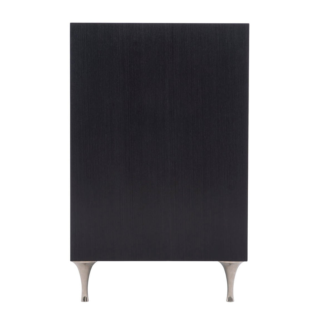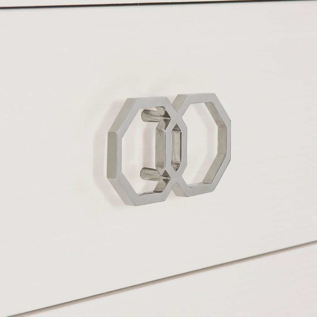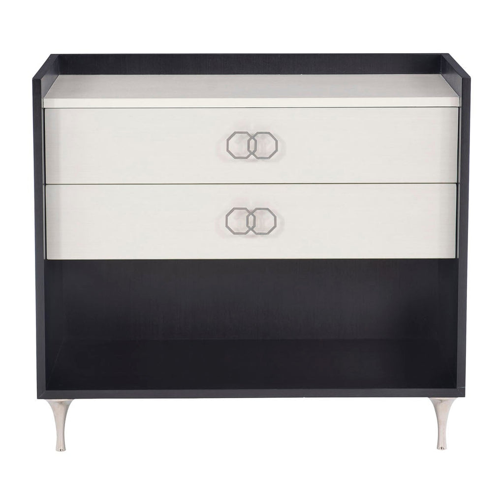 Silhouette is defined by bold contrasts and a hint of Hollywood Regency glamour. The Silhouette nightstand is a modern classic. A chic palette of black and white accentuates the unique design, which features two drawers in Eggshell finish that appear to float within a frame finished in Onyx. Delicate round tapered legs in polished stainless steel match the interlocking octagonal pulls.