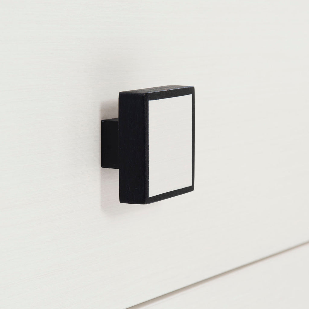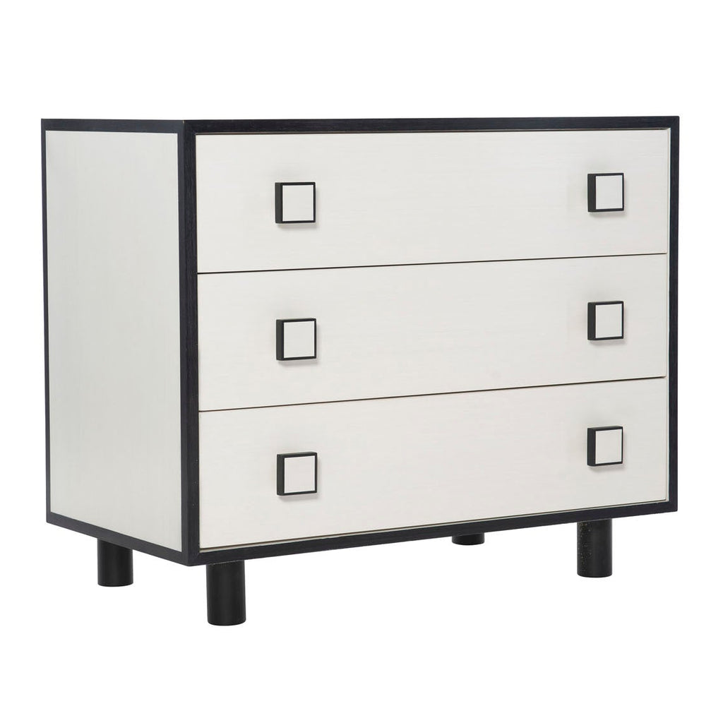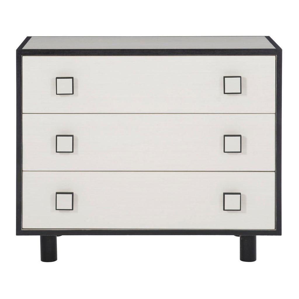 Silhouette is defined by bold contrasts, clean lines and a hint of Hollywood Regency glamour. With a chic palette of black and white, the Silhouette nightstand brings a dramatic edge to a minimalist form. Finished in Eggshell, the case features three drawers accented by square wood pulls in a two-tone finish. Borders and cylindrical feet in dark Onyx provide a striking contrast.