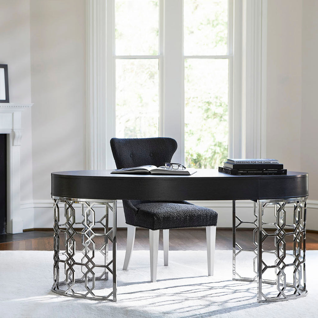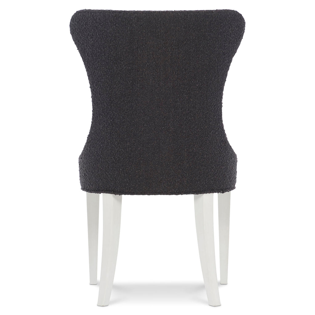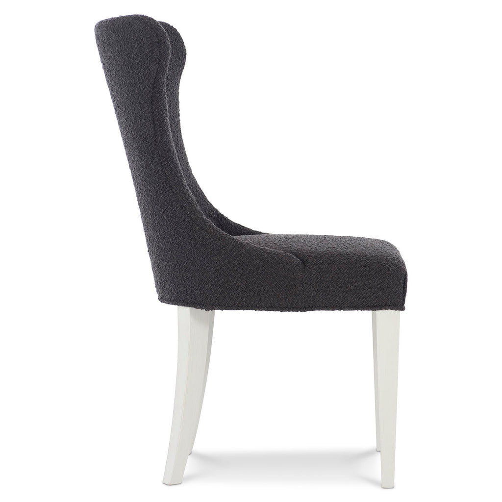 Silhouette is defined by bold geometry, soft curves and a hint of Hollywood Regency glamour. The Silhouette side chair abounds with delightful touches: a button-tufted hourglass back, cozy dark boucle upholstery, and back sabre legs contrasting with gently tapered legs in the front. This balanced piece expresses an understated extravagance.