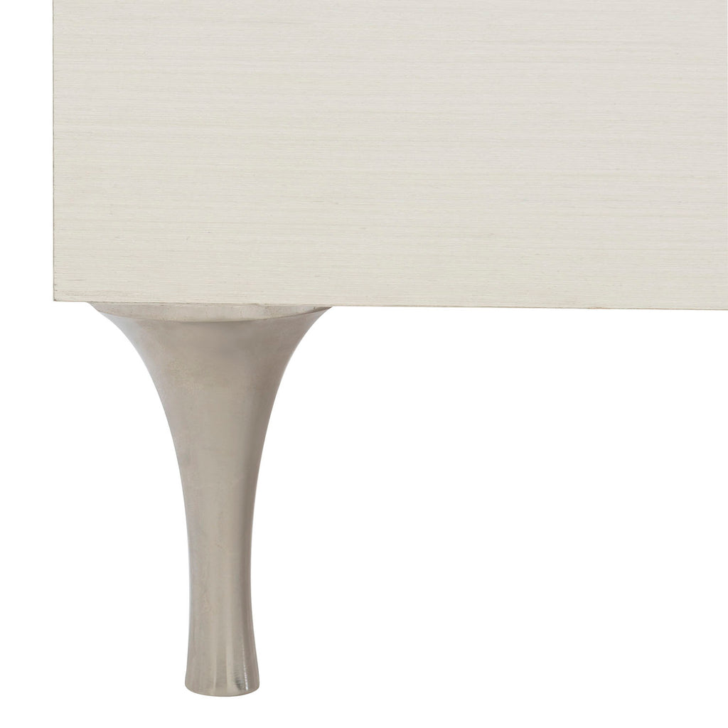Silhouette is defined by bold contrasts, clean lines and a hint of Hollywood Regency glamour. The Silhouette tall drawer chest is in a class of its own. Glamorous, sleek and modern, it features an Eggshell wood finish accented by polished stainless steel beading and hardware. Interlocking octagonal pulls and delicate round tapered legs add feminine allure.