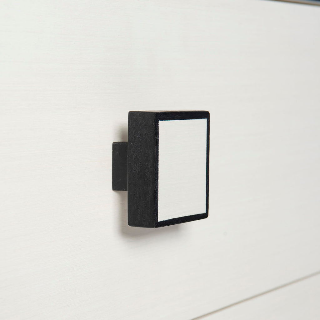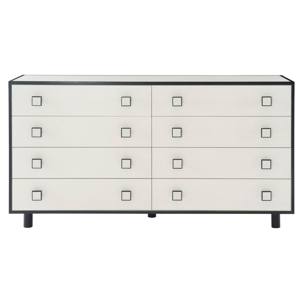 Silhouette is defined by bold contrasts, clean lines and a hint of Hollywood Regency glamour. With a chic palette of black and white, the Silhouette dresser brings a dramatic edge to a minimalist form. Finished in Eggshell, the case features eight drawers accented by square wood pulls in a two-tone finish. Borders and cylindrical feet in dark Onyx provide a striking contrast.