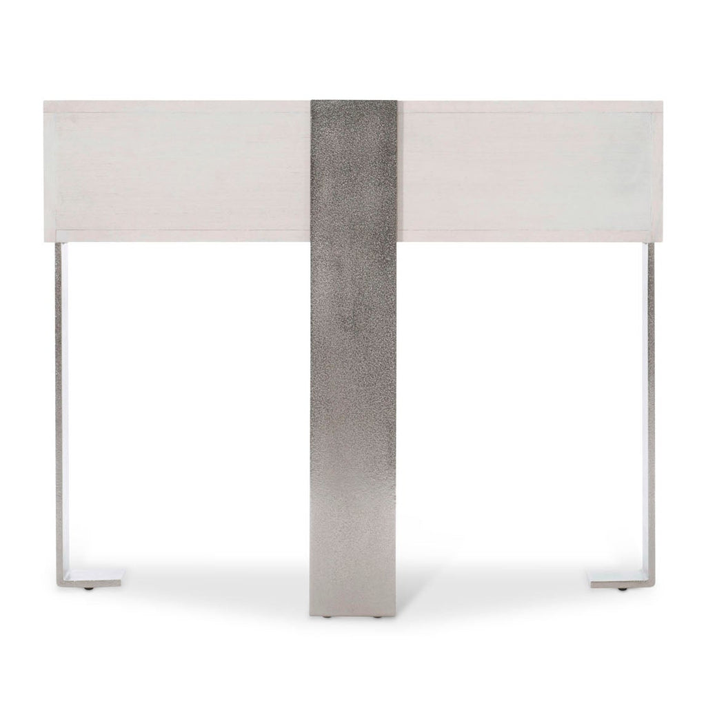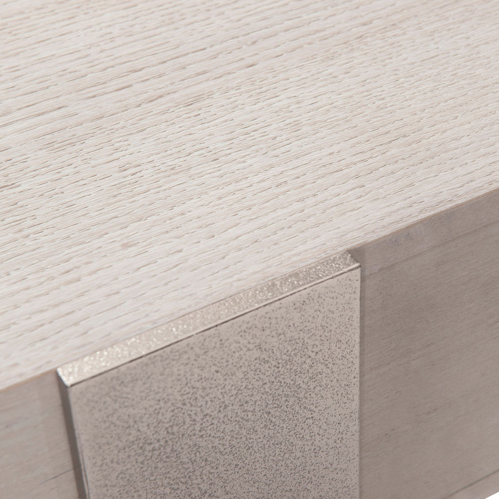 Three cast aluminum supports create a structural tripod, curving to the floor to define the legs of the Solaria nightstand. They encompass a drawer box with a chiseled cast resin front and a Weathered bone finish. A two-port USB charger is located on the upper back of the case.