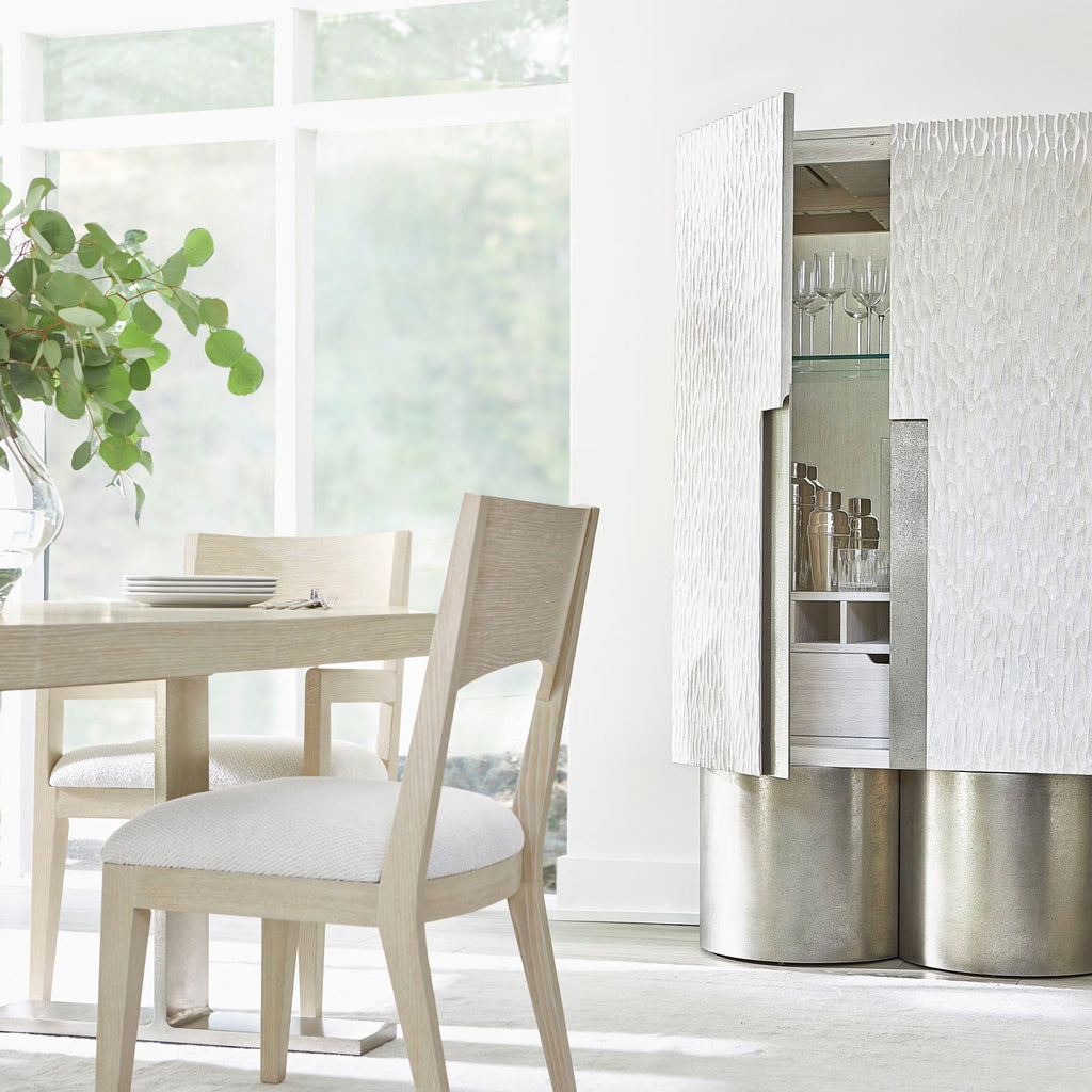 The unadorned profile of the Solaria arm chair allows the flawless craftsmanship to be highlighted. A lovely arched back is created from quartered white oak veneers, while the frame is quartered ash solids, both with a Dune finish. An upholstered seat offers comfort while maintaining the quiet nature of the design.