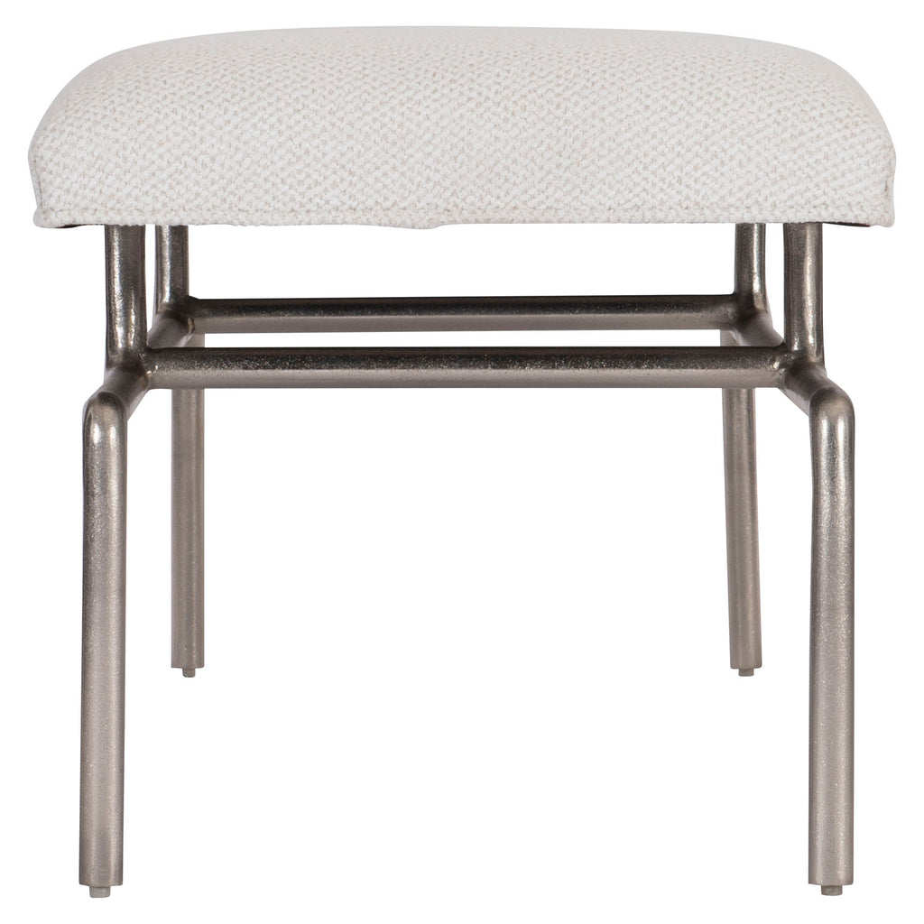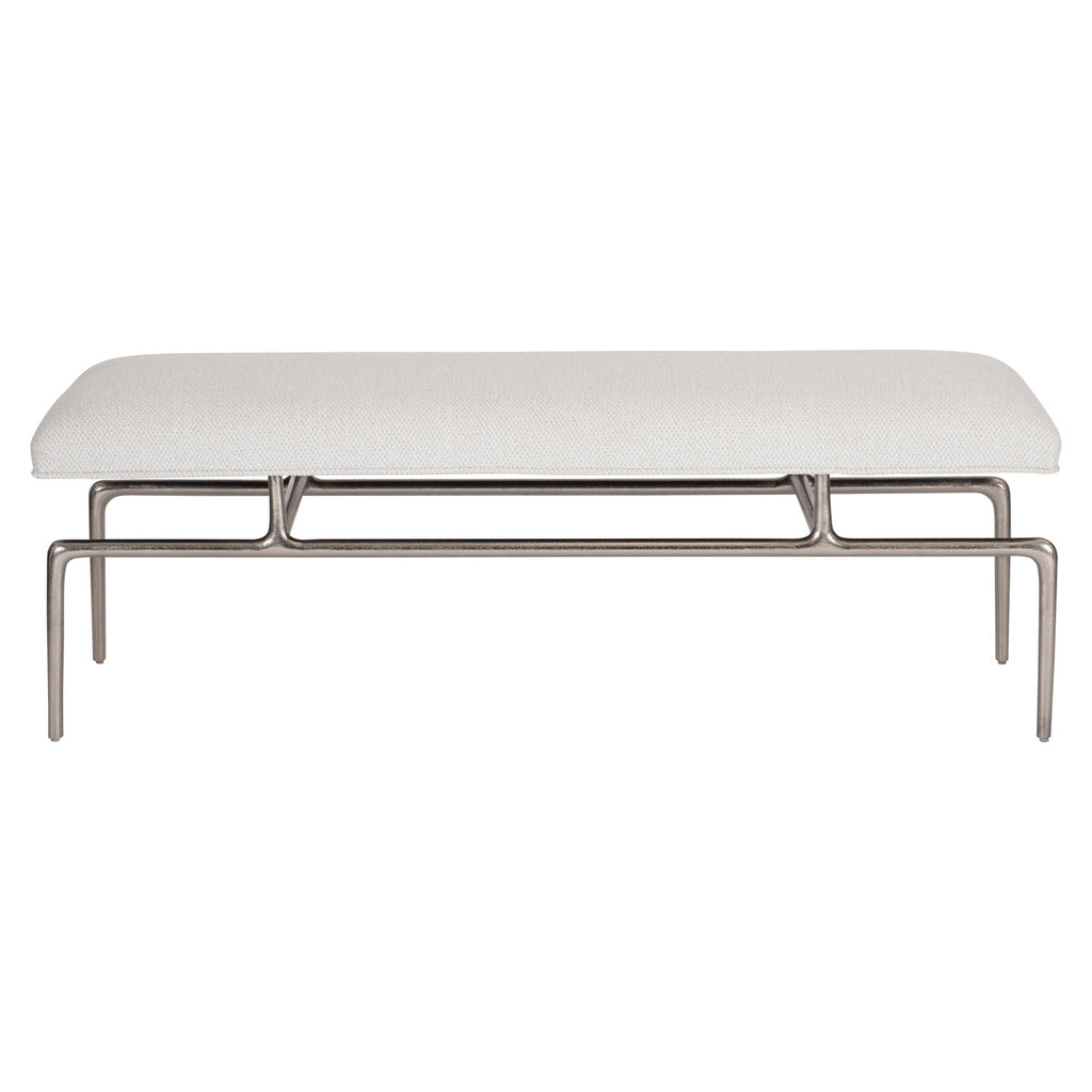 The Solaria bench has an architecturally inspired steel frame that supports an upholstered slip seat, showcasing the balance of form that’s a hallmark of the Solaria collection. The edges are softened as the legs bend toward a horizontal support, while central pillars lift the seat over the frame so that it almost floats above the metal base.