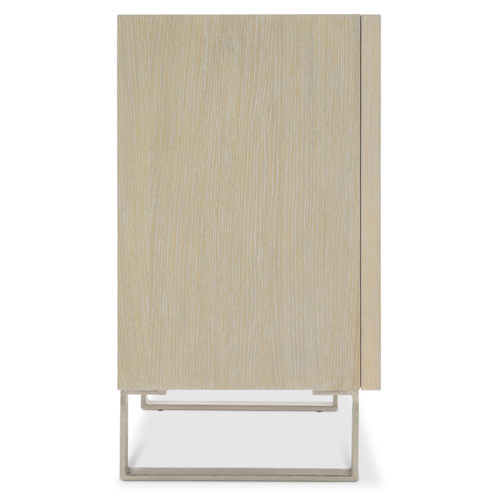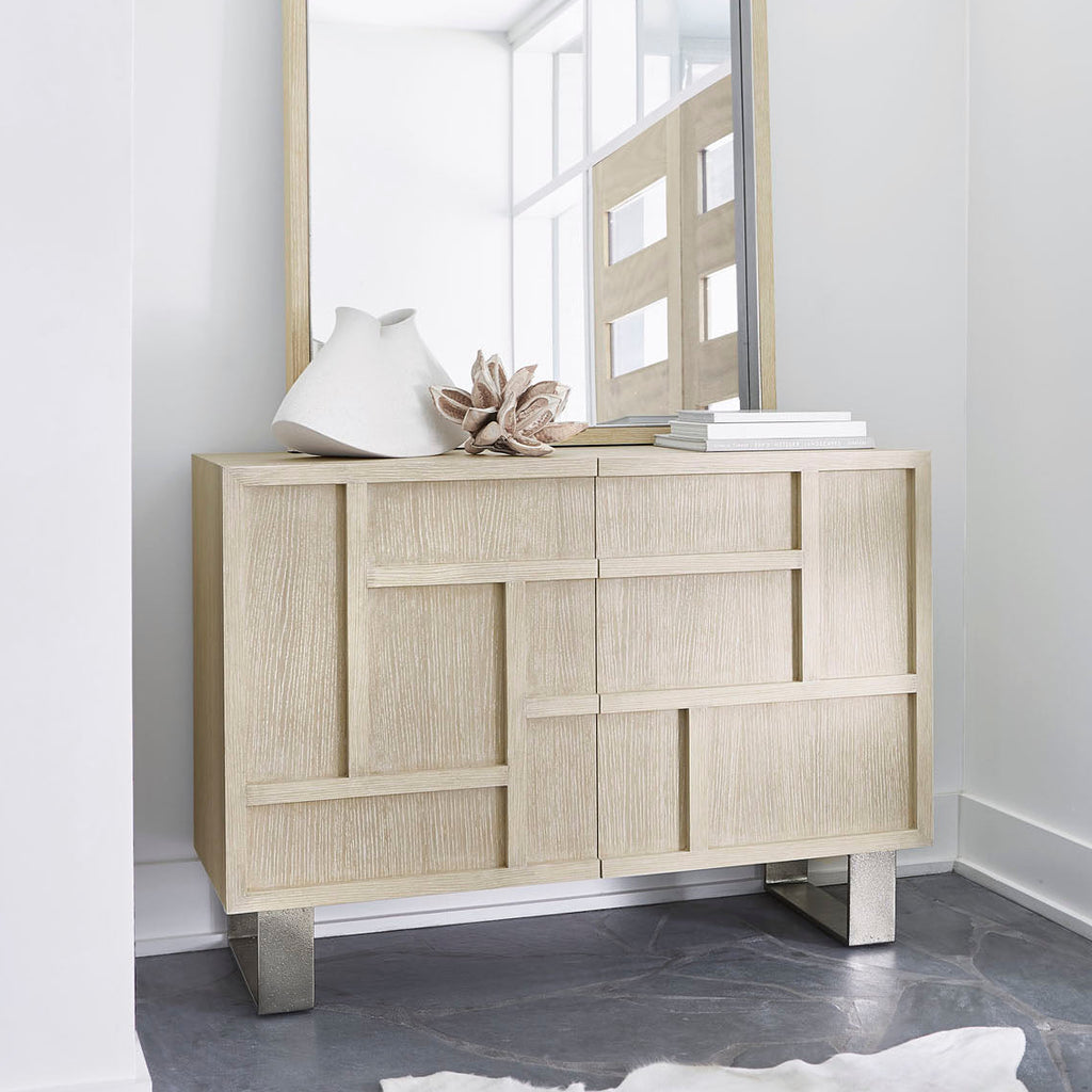 Wood overlays create squares and rectangles in gorgeous form for the Solaria door chest. A base of cast aluminum legs and a textural Dune finish on quartered white oak veneers compose an arresting design. Behind the doors are four adjustable or removable shelves, creating customizable storage.