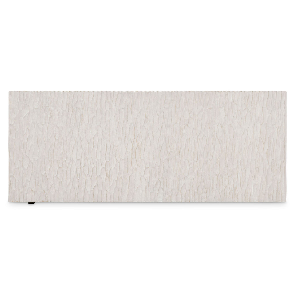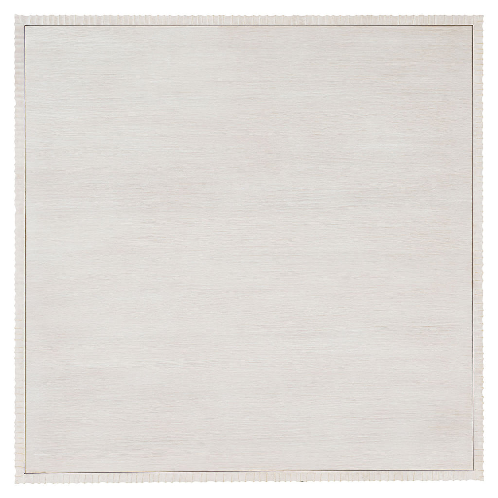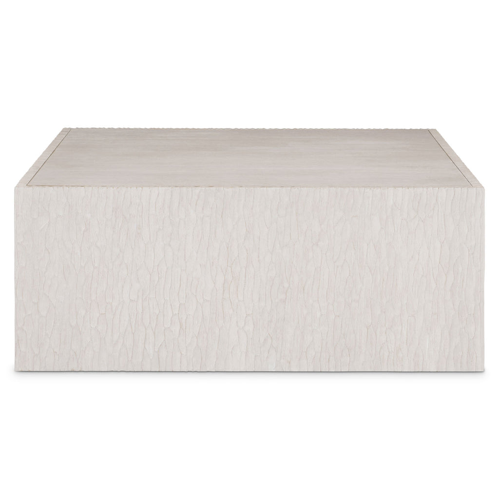 The square Solaria cocktail table softens the look of rough-hewn wood with a chiseled resin frame in a Weathered Bone finish. An inset wooden frame coordinates in the same finish. The expansive table is 44 inches on each side, giving it a substantial appearance, with hidden casters offering mobility.