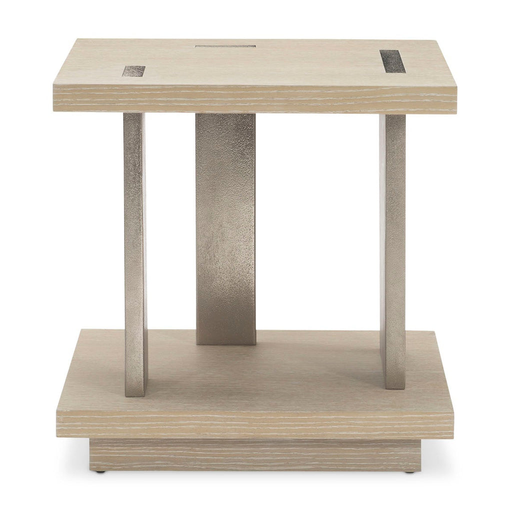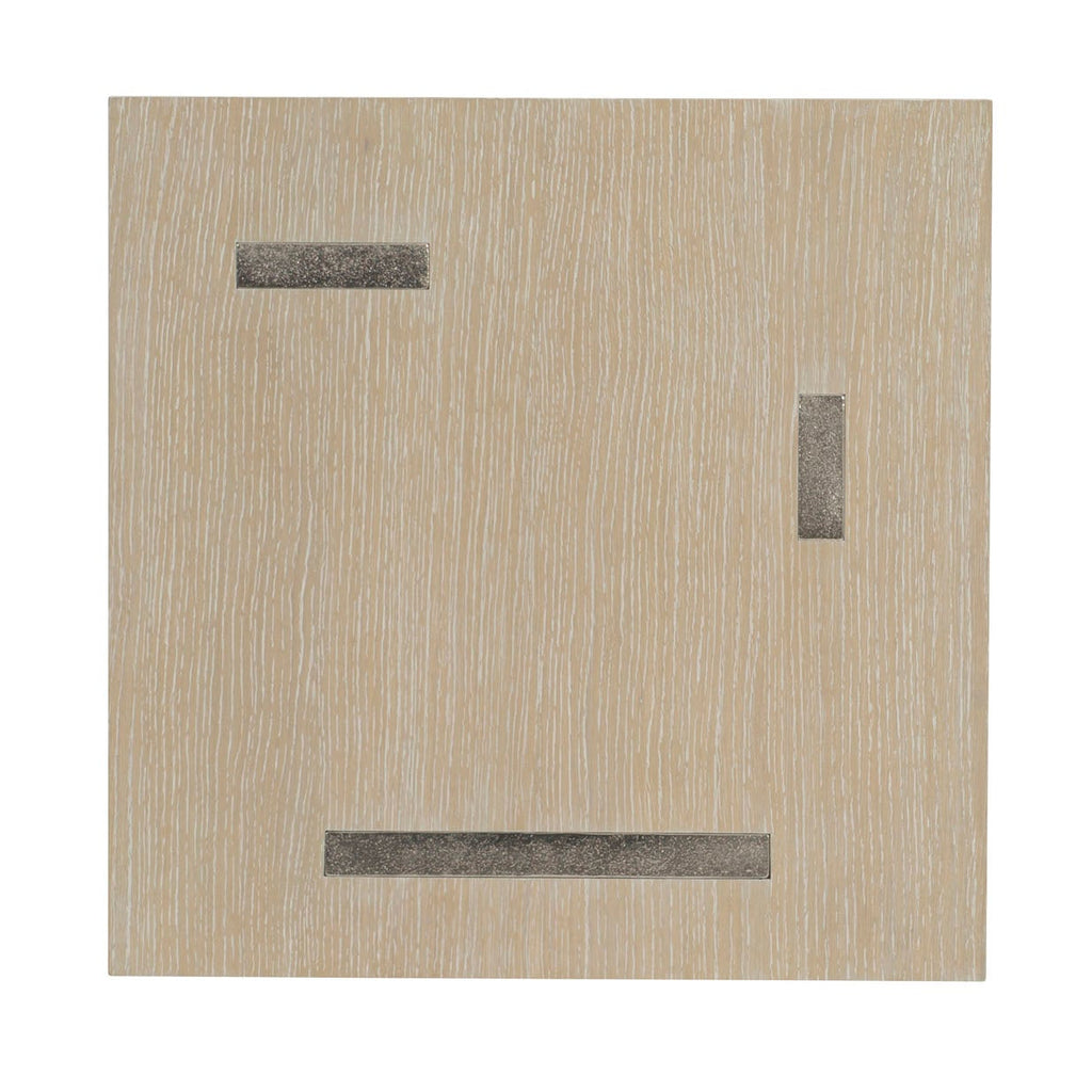 Cast aluminum panels in varying sizes create compelling supports for the Solaria side table. Resting on a plinth wooden base, the panels pierce the wooden top to create a stunning inset pattern on the tabletop. Quartered white oak veneers feature a Dune finish, while metal accents add shine.