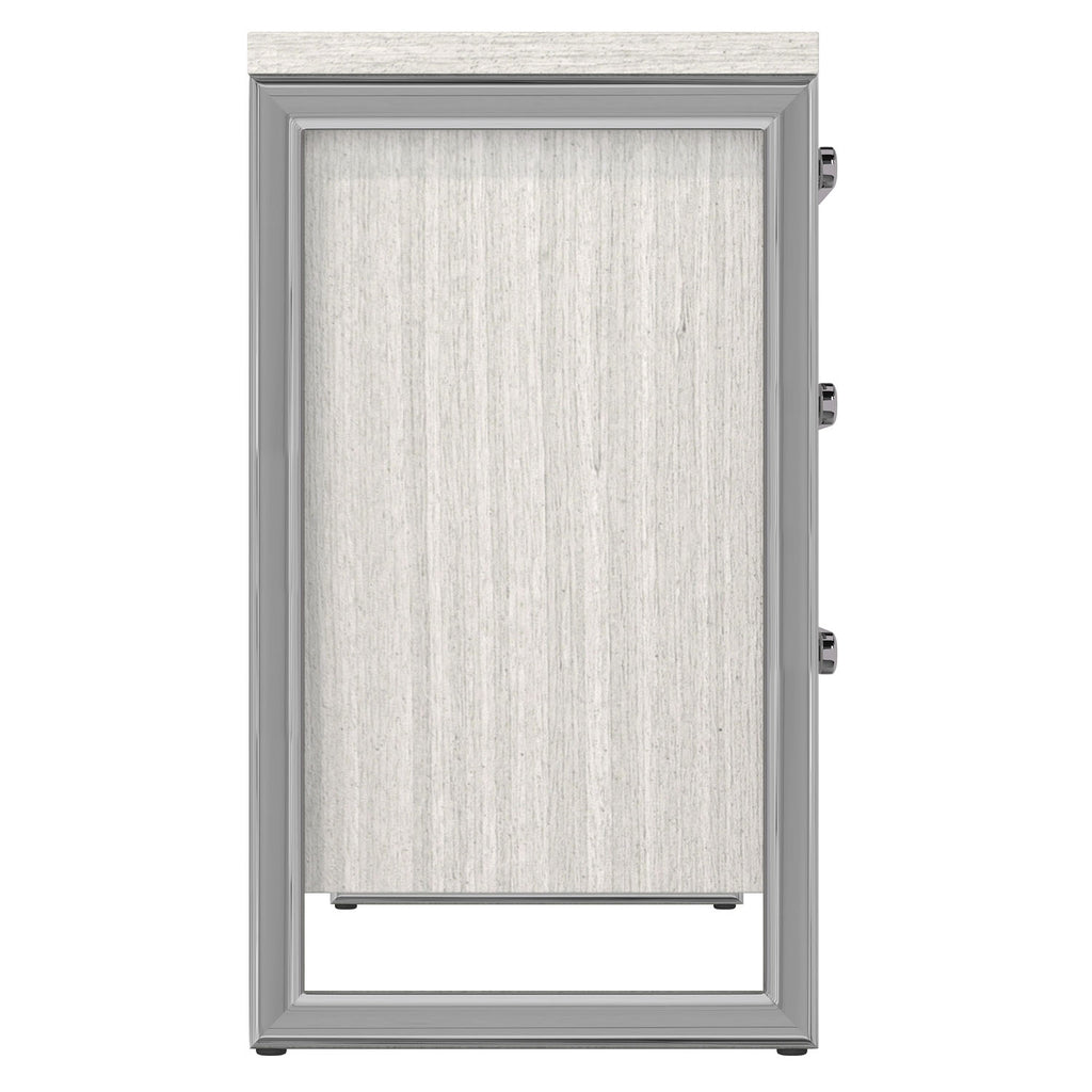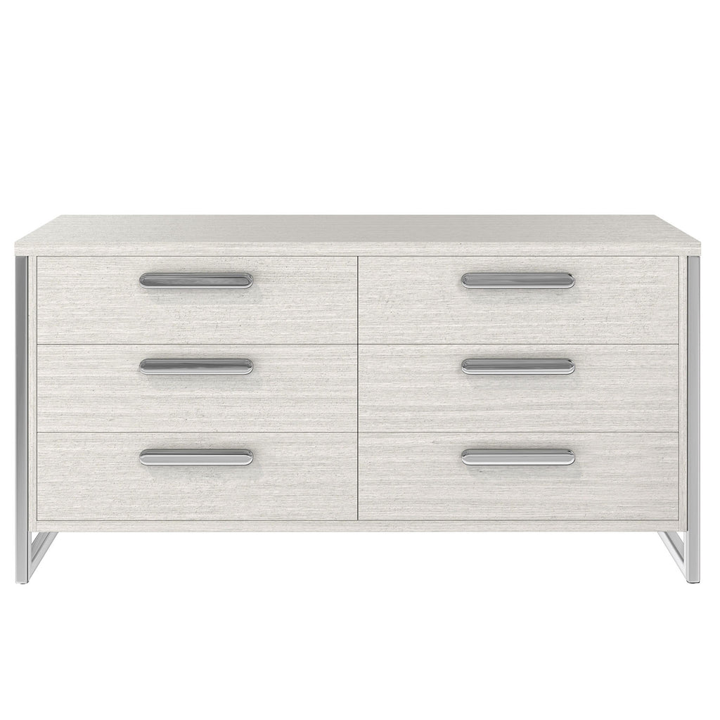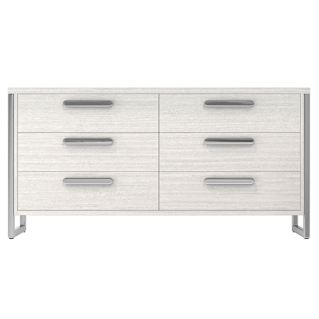 The Stratum dresser offers a bit of glamour with the gleam of polished metal from open end frames and sleek hardware. A beautiful wood grain pattern comes through in the Mist finish. Six soft-close doors provide ample storage.