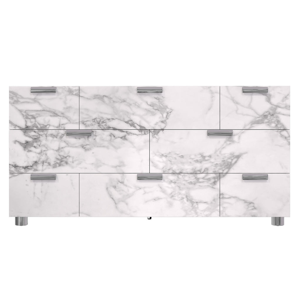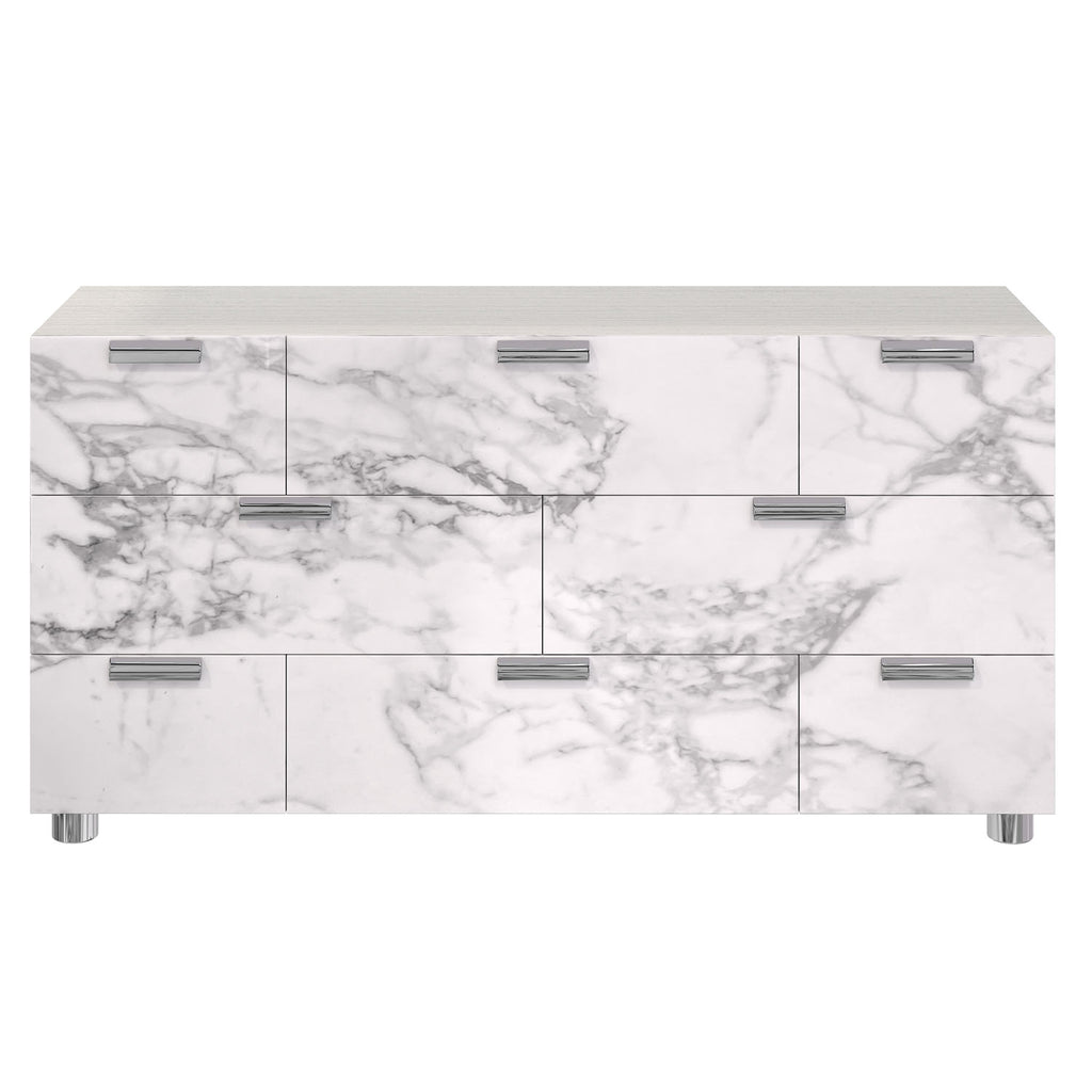 The Stratum dresser crafts a modern and eye-catching style in stunning Arabescato stone, covering eight soft-close drawer fronts. The marble look is complemented by a wood case in the Mist finish and polished metal hardware and feet.