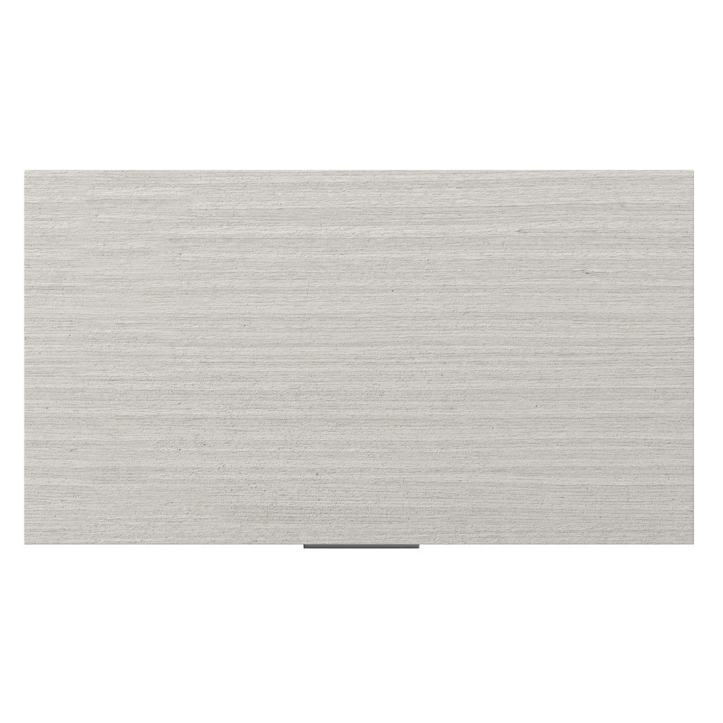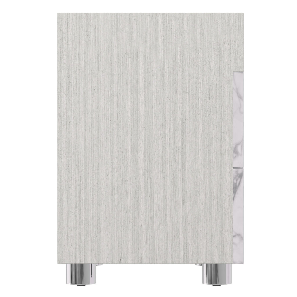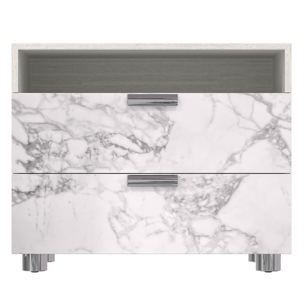 The Stratum nightstand crafts a modern and eye-catching style in stunning Arabescato stone, covering two soft-close drawer fronts below an open shelf. The marble look is complemented by a wood case in the Mist finish, and polished metal hardware and feet. A two-port USB charging unit is included on the upper back panel.